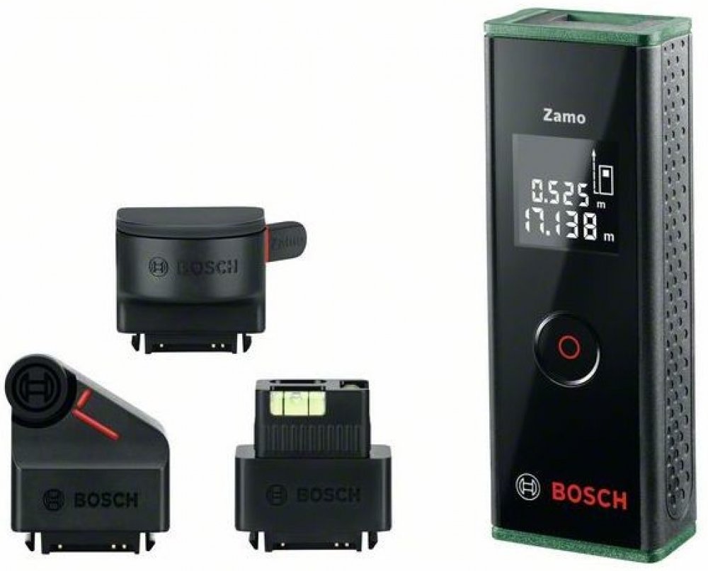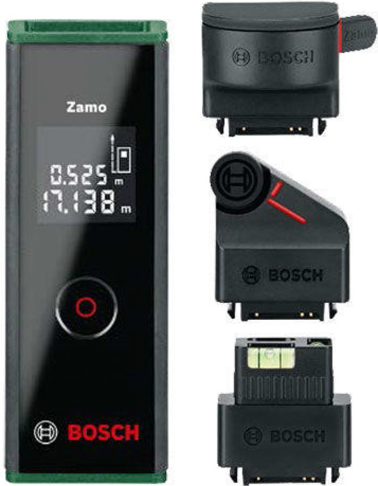 Výpočet vzdáleností a ploch je s laserovým dálkoměrem Zamo III tak jednoduchý, jako nikdy předtím! Digitální laserové měření umožňuje přesné a efektivní měření vzdáleností do 20 m. Zejména jednoduchým jednotlačítkovým ovládáním zajišťuje laserový dálkoměr značky Bosch maximální komfort uživatele - prostě dvakrát klikněte a nechte ihned vypočítat plochy. Nové rozhraní je navíc vybaveno adaptérem pásma, adaptérem kolečka a adaptérem linie pro velké množství aplikací. Díky němu vám Zamo III Set se třemi obsaženými adaptéry nabízí širší možnosti použití pro digitální laserové měření: Adaptér měřicího pásma za vás převezme přesné měření krátkých vzdáleností nebo objektů. Křivky a vzdálenosti lze efektivně snímat a měřit pomocí adaptéru měřicího kolečka. Pro zvlášť rychlé vyrovnání objektů se hodí adaptér liniového laseru.