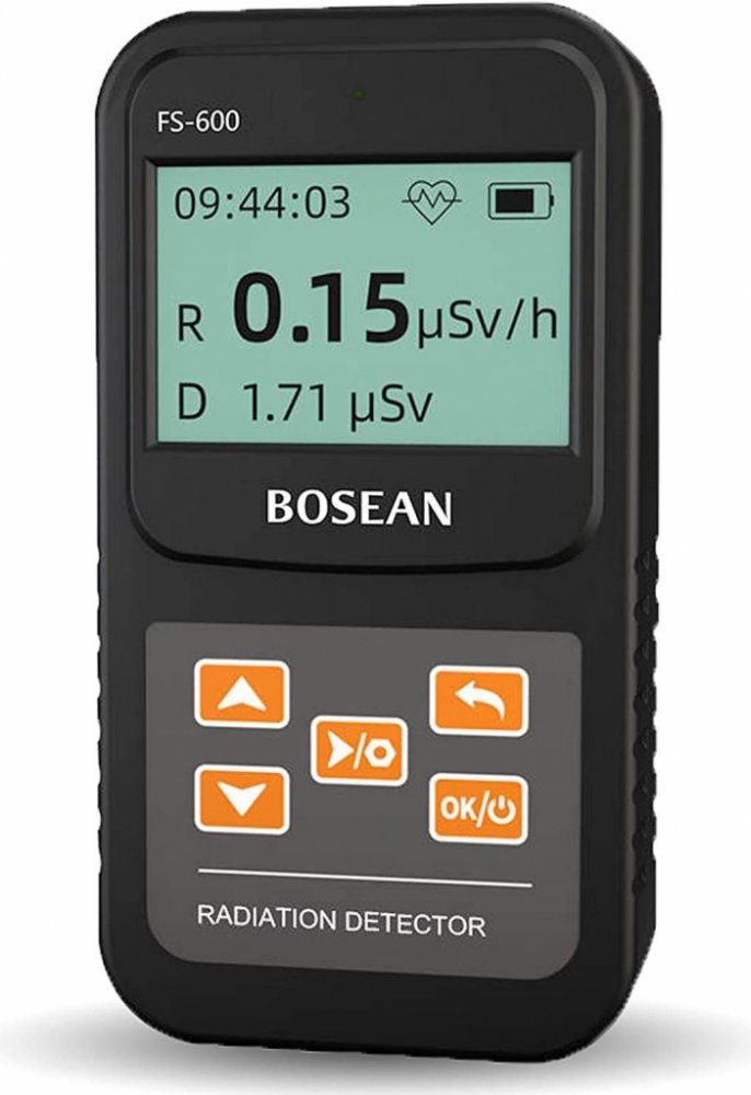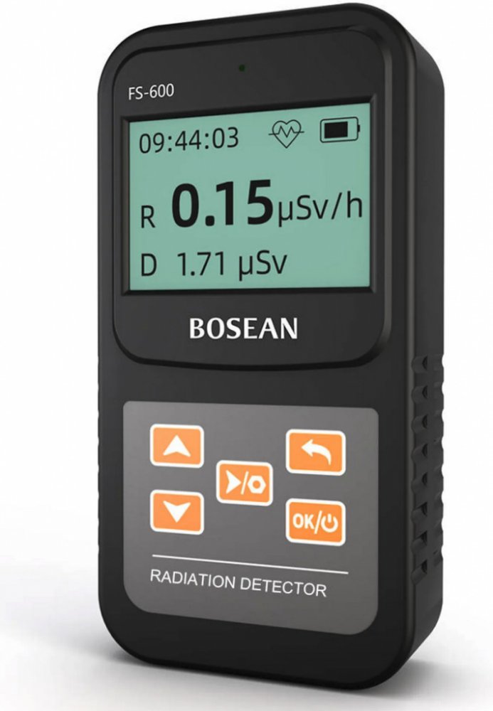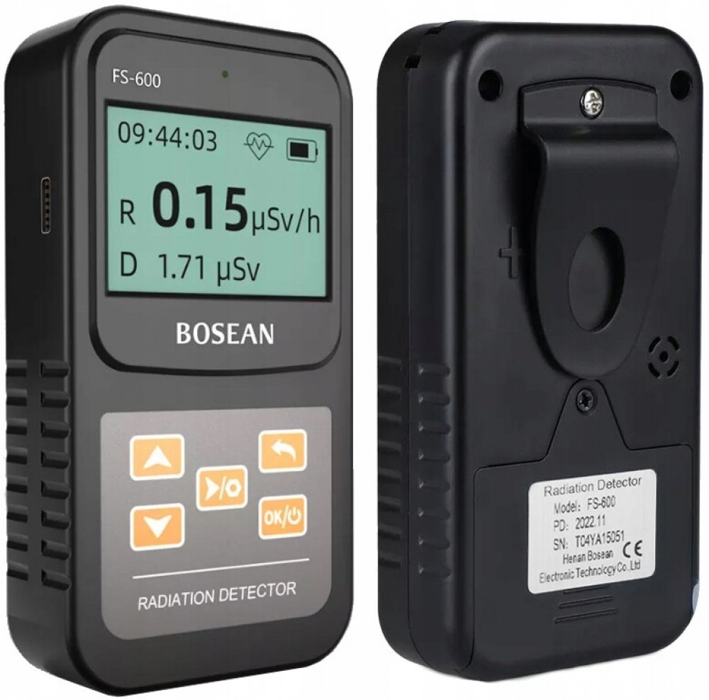 Bosean digitální dozimetr a Geigerův čítač FS-600 - detektor Beta, Gama a Rentgenových paprsků. Přístroj detekuje záření pomocí tzv. Geiger-Müllerovy (GM) trubice plněné plynem, která detekuje zachycené ionizující částice ve formě impulzů. Naměřené hodnoty jsou v reálnem čase zobrazeny na velkém LCD displeji 64*128 s nastavitelným podsvícením ON/OFF. Přístroj zobrazuje aktuální a průměrnou hodnotu radiace v měřeném místě společně s grafem, který znázorňuje výskyt záření v závislosti na čase v rozsahu 0.1μSv/h~10000μSV/h (1000μSv/h = 1mSv). Prahové hodnoty je možné nastavit. Hodnota kumulované radiace zůstane uložena i v případě náhlého přerušení provozu přístroje. Osobní i profesionální dozimetr Přístroj se velmi snadno ovládá a najde své využití při inspekci materiálů, enviromentálních zkouškách, screeningu radiofarmak a radiologické ochraně. Vyznačuje se velmi vysokou citlivostí a širokým rozsahem měření, zejména s nebezpečným gama zářením*. Okamžitě po spuštění se zobrazí rozhraní