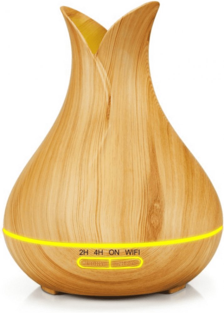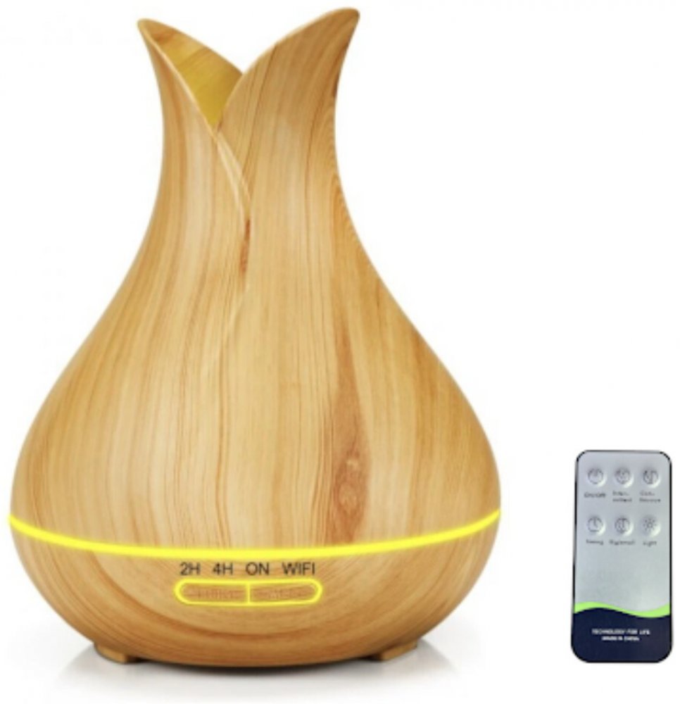 Aroma difuzér, objem nádoby 400 ml, 7 barev podsvícení, doba provozu 12 hodin, dálkové ovládání, podsvícení a časování zapnutí a vypnutí, barva: světle hnědé dřevo.