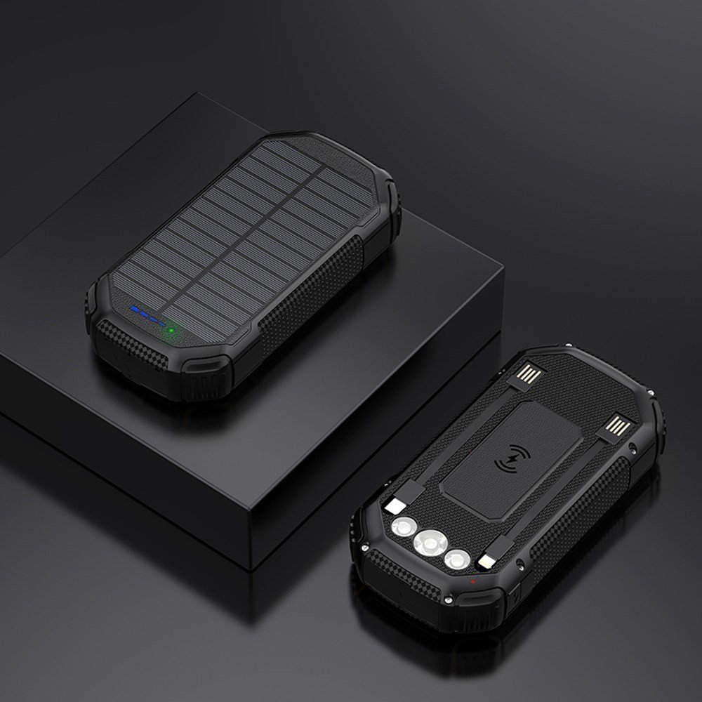 Solární powerbanka se skládá z lithium-polymerových baterií o celkové velikosti 20 000 mAh. Pomocí 4 LED diod je možné sledovat zbývající kapacitu solární powerbanky. Díky dvěma USB vstupům lze zapojit rovnou dvě zařízení najednou. Tento produkt je vhodný rovněž, když jste na cestách, protože je vybavený voděodolnou ochranou IP67. Kromě toho lze na spodní straně nalézt LED svítilnu, který dokáže svítit i v různých režimech jako je například režim SOS.
