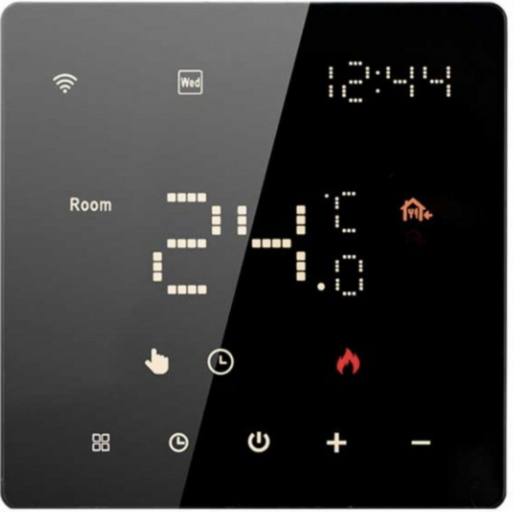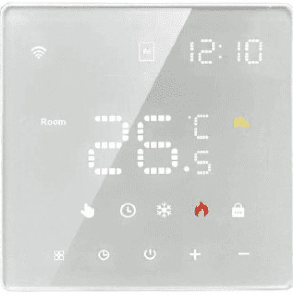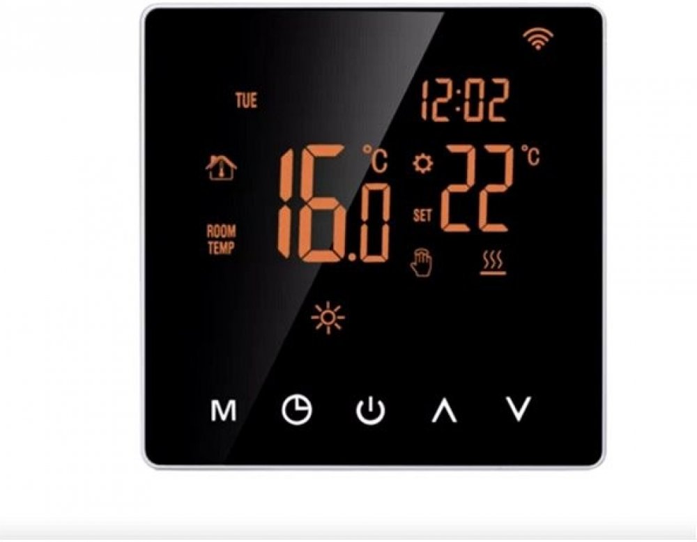 Termostat - pokojový, připojení skrze WiFi 2,4 GHz, programovatelný, ke kotli, na radiátor, digitální, dotykový a podsvícený displej, podporuje Android a iOS, kompatibilní s Tuya, Google Assistant a Amazon Alexa, síťové nabíjení