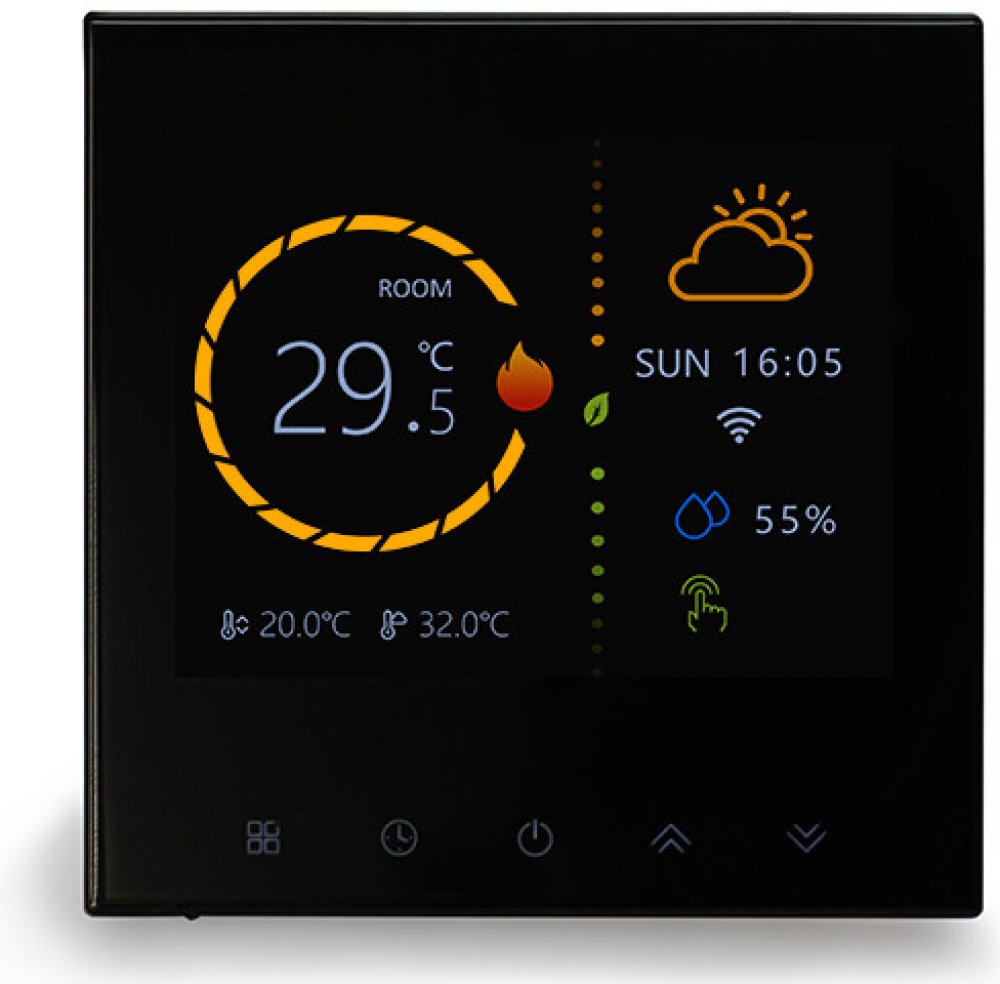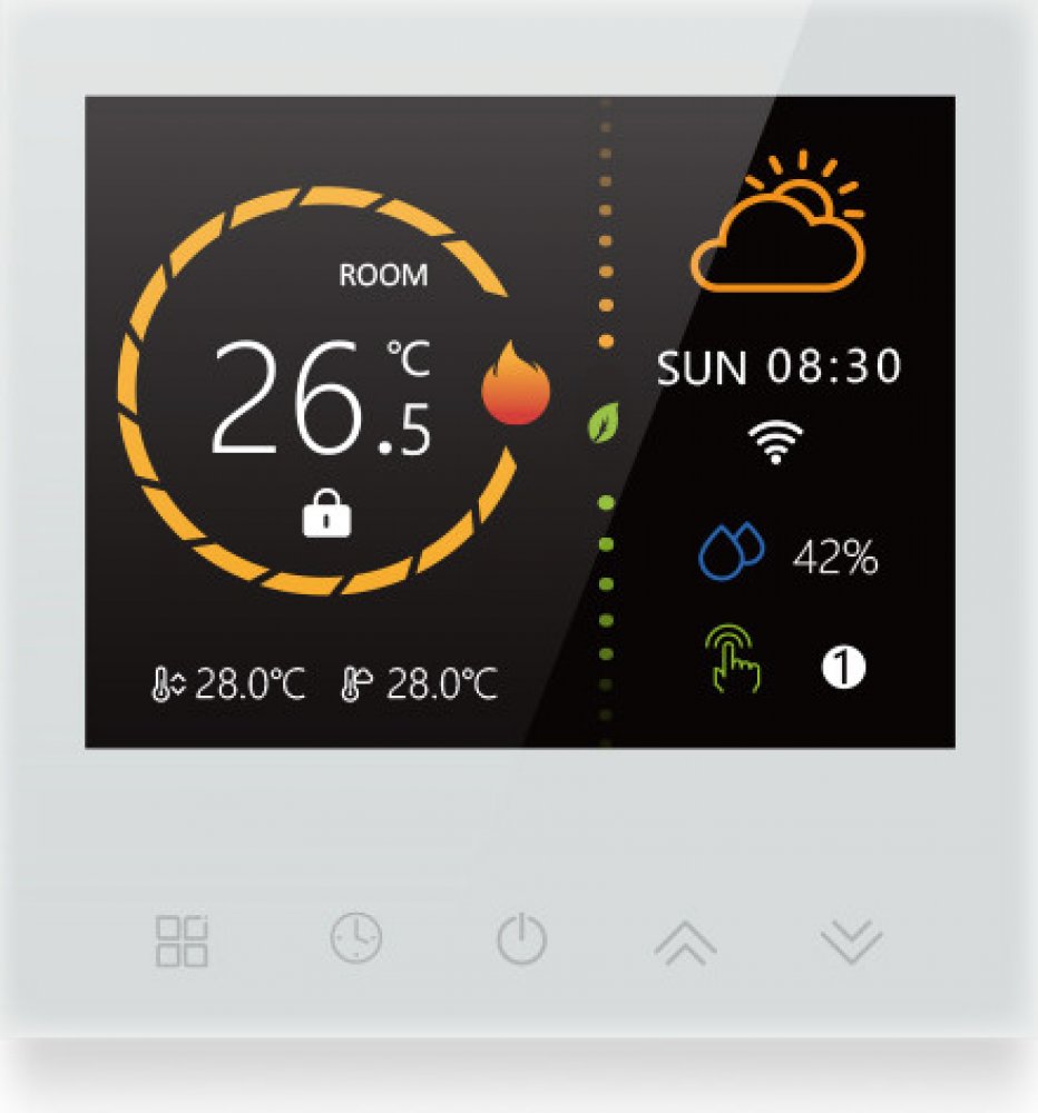 Dotykový TFT displej o velikosti 3,5" zajišťuje přehledné a intuitivní ovládání. Displej současně zobrazuje aktuální teplotu v místnosti, nastavenou cílovou teplotu i venkovní podmínky – včetně počasí a vlhkosti. Díky elegantnímu designu v bílé nebo černé barvě a tenkému profilu (pouze 11 mm) se termostat hodí do jakéhokoli interiéru.