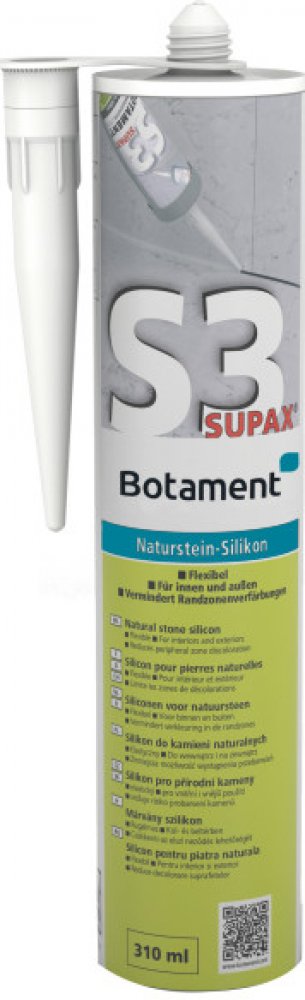 S3 Supax je elastický těsnicí tmel pro výplň dilatačních a napojovacích spár v přírodních kamenech, dále pro použití v trvale mokrém prostředí, rovněž bazénech, na balkónech a terasách. Botament S3 Supax má ve vytvrzeném stavu vysokou odolnost proti působení horké vody, UV – záření, stejně tak běžným čisticím prostředkům.