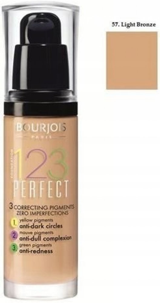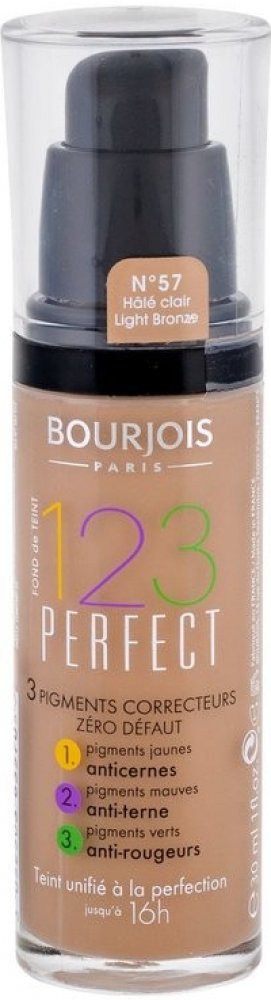 Dejte sbohem mdlé pleti a zarudnutí! 123 Perfect Foundation od Bourjois je podkladová báze, která vám umožní užívat si bezchybnou pleť a dokonalé líčení až po dobu 16 hodin. Jeho inovativní složení obsahuje tři pigmenty korigující pleť: (1) Žluté pigmenty redukují tmavé kruhy pod očima. (2) Fialovorůžové pigmenty zajišťují svěží pleť bez skvrn a pih. (3) Zelené pigmenty maskují popraskané kapiláry a červené stopy po akné. 123 Perfect Foundation lehce zmatňuje, dlouhodobě hydratuje a je obohacen o SPF10, abyste vypadala nádherně po celý den! Dekorativní kosmetika v naší nabídce nese jména těch nejslavnějších kosmetických značek. Make-upy značky Bourjois vám pomohou vytvořit dokonalý look. Naše make-upové zakládání Bourjois 123 pro dokonalý vzhled pleti v odstínu 57 Hale Clair dodá vaší pleti bezchybný vzhled s optimální krycí schopností. S lehkou texturou a dlouhotrvajícím efektem, tento make-up bude vaším spolehlivým pomocníkem po celý den. S hydratačními vlastnostmi a UV ochranou, vaše pleť bude vypadat svěže a zdravě. Dopřejte vaší pleti luxusní péči s Bourjois 123 Make-up pro dokonalý vzhled pleti. Bourjois 123 Perfect Foundation 57 Light Tan 30 ml BOURJOIS_123 Perfect Foundation sjednocující podkladová báze 57 Light Bronze 30ml