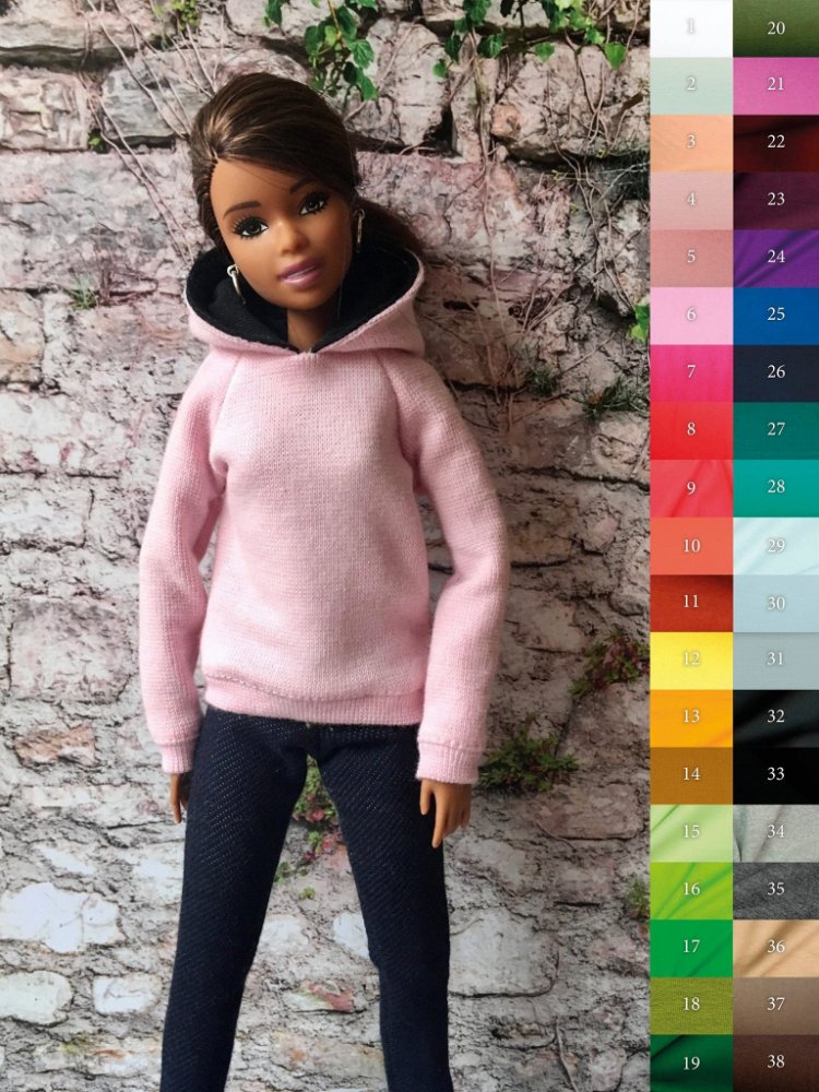 Jednoduchá mikina s kapucí se zapínáním na suchý zip pro panenku v měřítku 1/6 nebo jiné podobné panenky. K dispozici v mnoha barvách, vždy v kombinaci s černou uvnitř kapuce. Vyberte si svou oblíbenou!