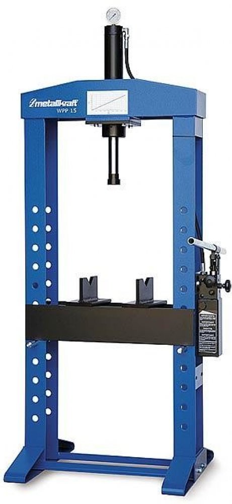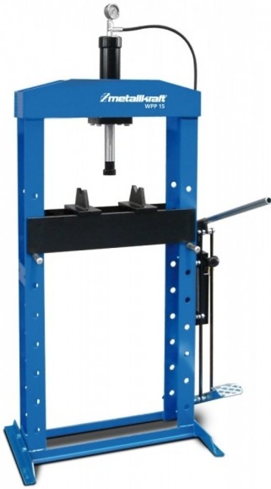 Ruční hydraulický lis WPP 15 Metallkraft® Hydraulický sloupový lis s ruční pumpou. Pro všechny opravářské a montážní práce, např. rovnání os, nosníků, hřídelí apod. vylisování a nalisování ložisek, svorníků a pouzder; zátěžové zkoušky a zkoušky svárů a mnoho jiných. Stabilní svařovaná konstrukce Robustní rám s děrováním pro přestavení pracovního stolu Spolehlivá a přesná hydraulika evropské výroby...