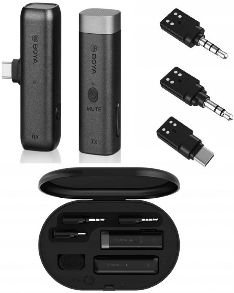 - 2x vysílač Boya BY-TX4 Pro s klopovým mikrofonem