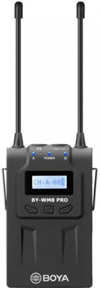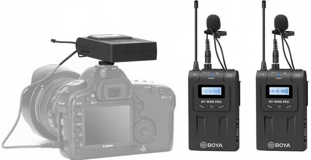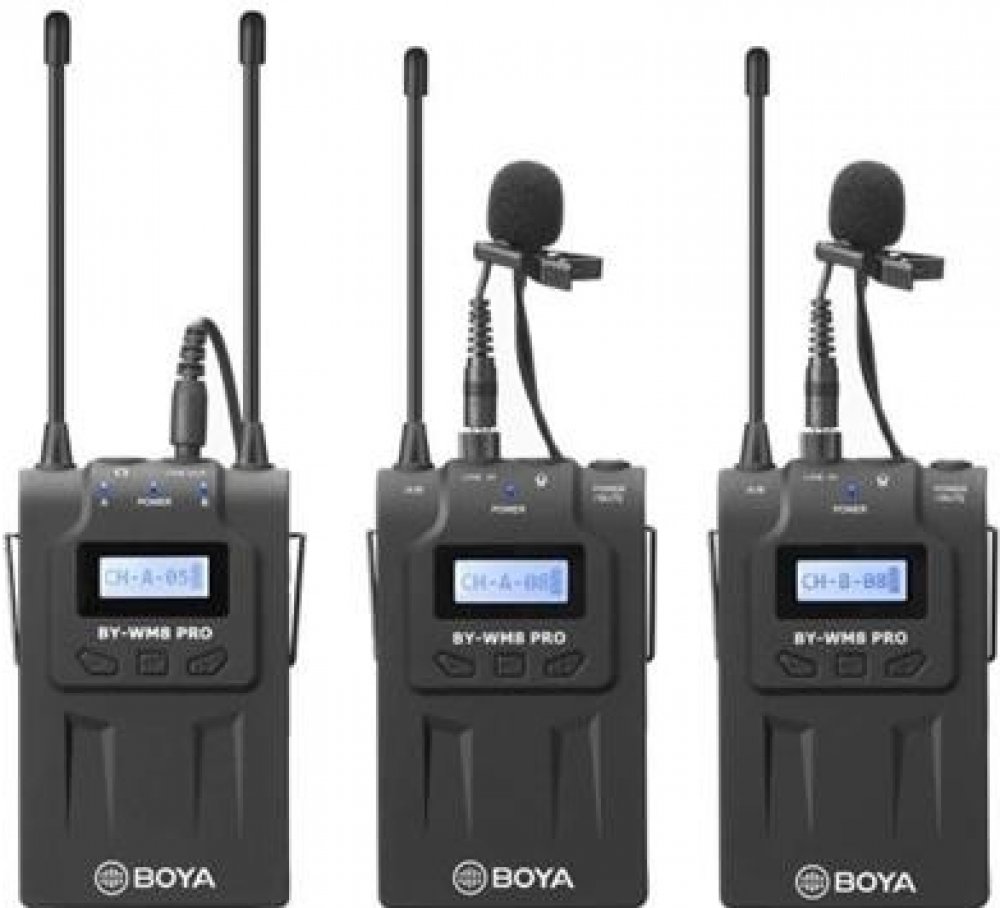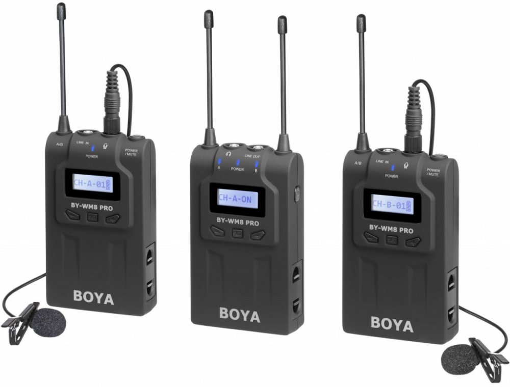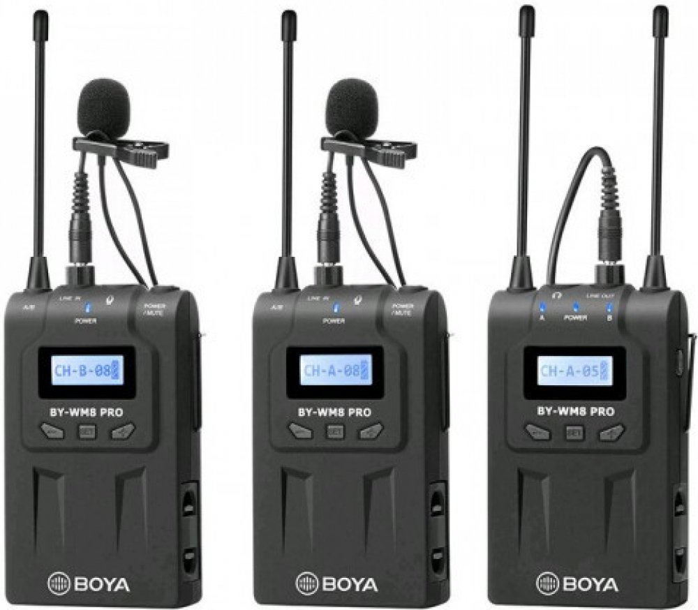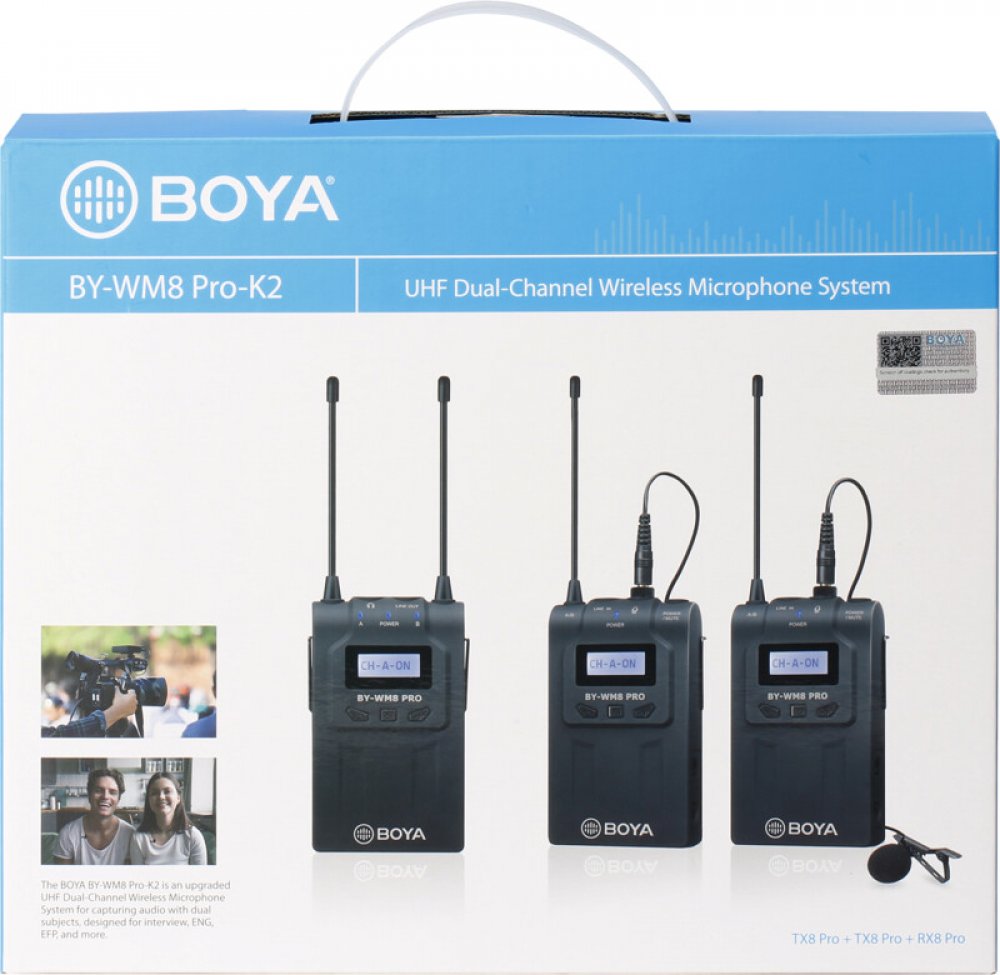 Bezdrátový mikrofonní UHF systém Boya BY-VM8 Pro K2 využívá 48 kanálů ve 2 skupinách a elektronické ladění kmitočtu pomocí PLL syntezátoru. Skládá se ze 2 vysílačů TX8 Pro, z přijímače RX8 Pro a ze 2 lavaliérových mikrofonů s omnidirekcionálním polárním vzorem, který přijímá zvuk stejně kvalitně a se stejným ziskem ze všech stran, takže snímaný hlas zní stále čistě a přirozeně.