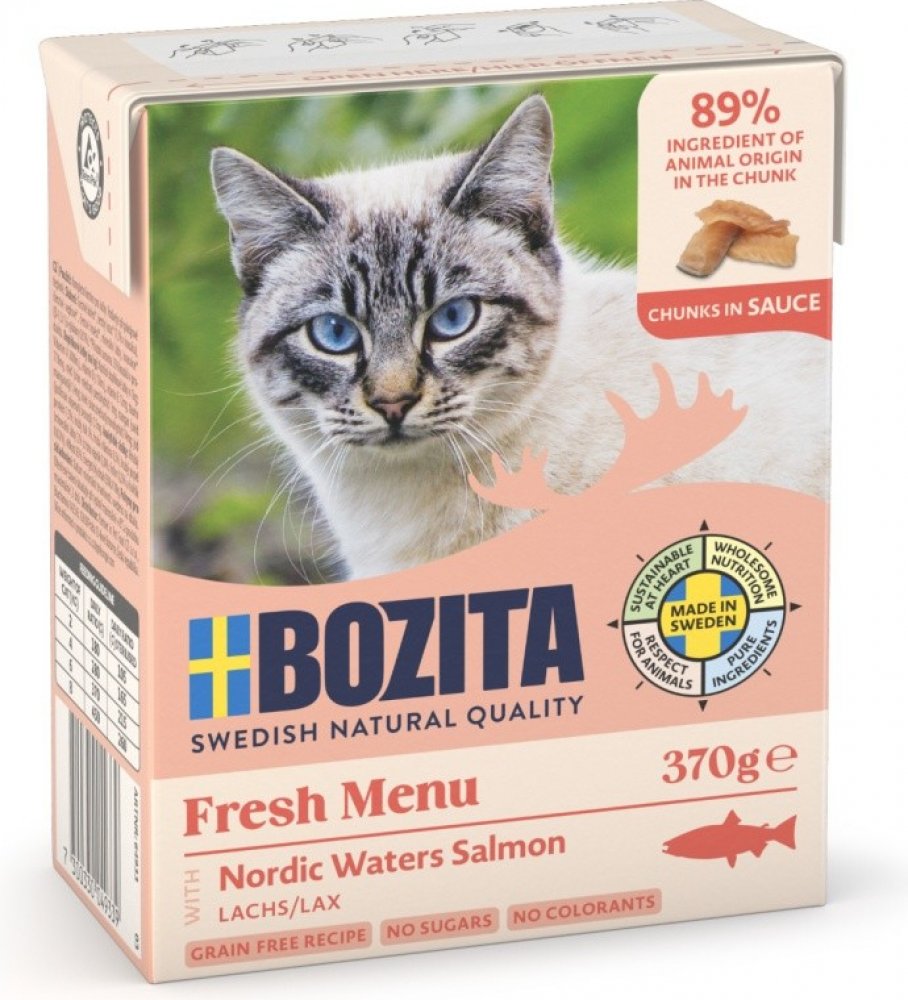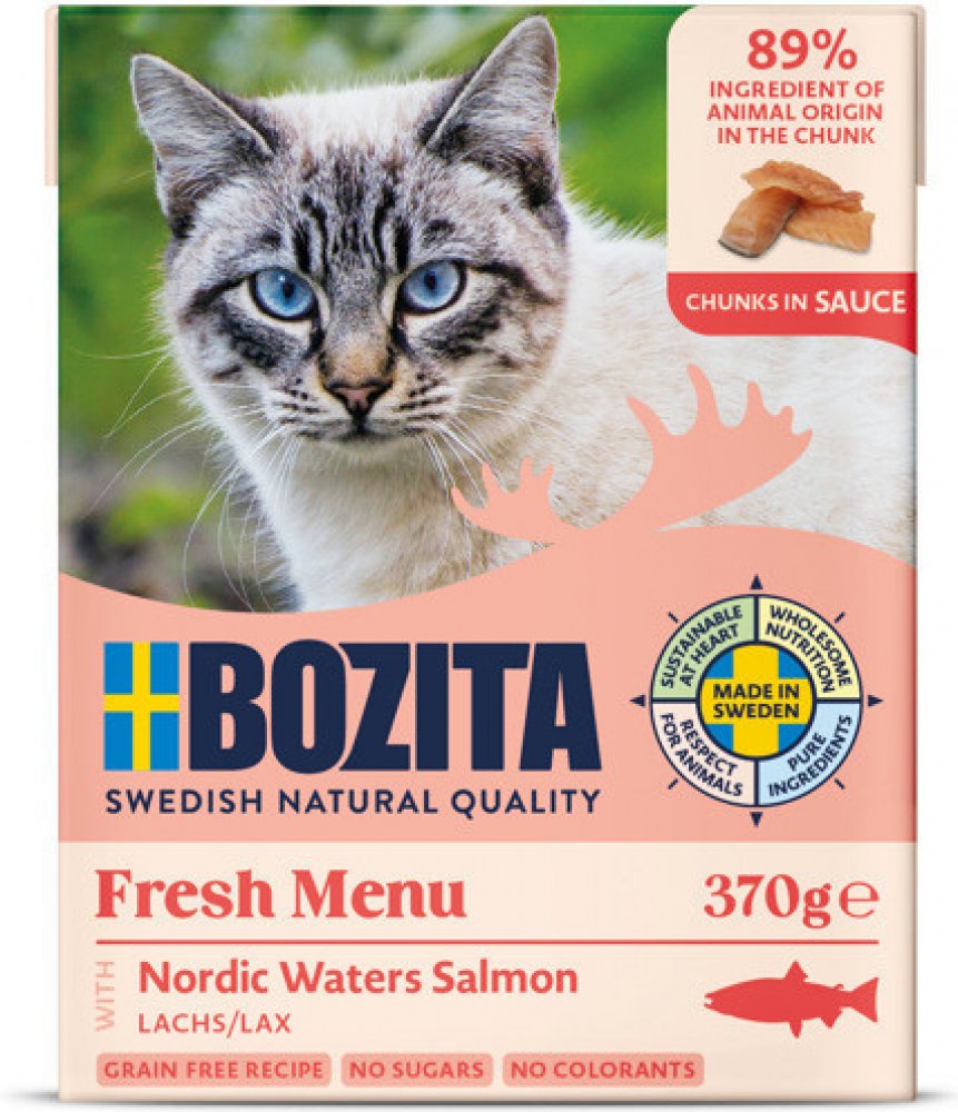 Bozita kousky v omáčce se zakládá na použití prvotřídních surovin, jako je švédské hovězí, vepřové a kuřecí maso či ryby. Delikátní krmivo Bozita obsahuje všechny živiny, vitamíny a minerály, které kočka potřebuje. Vyvážené krmivo pro kočky obshuje Microgard, přírodní ß-Glukan, který posiluje imunitní systém Vaší kočky. Společně s bílými krvinkami je posilována také obranyschopnost.