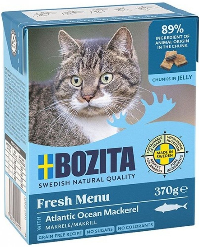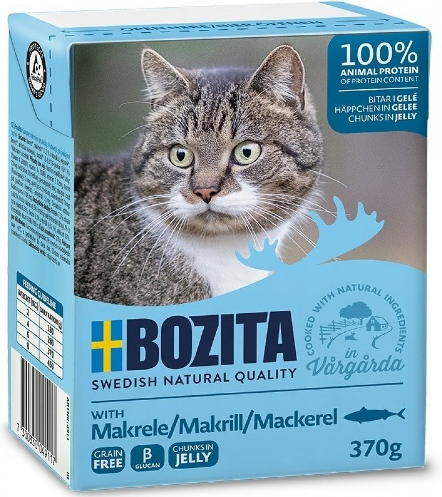 Superprémiové mokré krmivo pro kočky.Složení: kuřecí, makrela (7,2 % v kouscích), vepřové, hovězí, uhličitan vápenatý, kvasnice (z toho ß-1,3/1,6-glukany 0,01 %).Nutriční doplňkové látky v 1 kg: Vitamin A 2000 IU, vitamin D3 200 IU, vitamin E 12 mg, taurin 770 mg, měď (jako síran měďnatý pentahydrát) 2 mg; mangan (jako oxid manganatý) 1,4 mg, zinek (jako síran zinečnatý monohydrát) 14 mg, jód (jako jodičnan vápenatý bezvodý) 0,1 mg.Analytické složení: hrubý protein 7,5 %, hrubý tuk 5 %, hrubá vláknina 0,5 %, hrubý popel 2 % (z toho vápník 0,35 %, fosfor 0,3 % a hořčík 0,02 %), vlhkost 83 %. Metabolizovatelná energie 330 kJ / 100 g.Krmný návod:2 kg / 180 g4 kg / 280 g6 kg / 370 g8 kg / 450 g