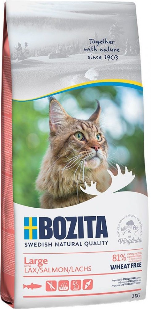 Bozita Large bez pšenice je kompletní vyvážené suché krmivo, které je vhodné zejména pro velké kočky, které mají sklon k hltání. Granule jsou extra velké, a podporují tak pomalejší příjem potravy. Krmivo pro kočky Bozita je připraveno s lahodným lososem, který je snadno stravitelný a pomáhá zajistit optimální vstřebávání živin. Losos obsahuje omega-3 a -6 mastné kyseliny, které v kombinaci se zinkem a biotinem podporují krásnou srst a zdravou pokožku. Kromě toho jsou především pro velké kočky obzvláště důležité další složky, jako je glukosamin a chondroitin sulfát, které přispívají k dobré funkci kloubů. Bozita Large obsahuje také prebiotickou vlákninu, která podporuje vyváženou střevní flóru. Granule jsou vyrobené bez pšenice a obsahují pouze vybrané přírodní složky. Bozita Large bez pšenice: Bezobilné granule pro dospělé kočky Ideální pro velké kočky Anti-Hairball receptura: s nestravitelnou vlákninou, která snižuje riziko tvorby chlupových bezoárů Bez pšenice: vhodné také pro kočky s odpovídajícími alergiemi a nesnášenlivostmi S omega-3- a -6 mastnými kyselinami, biotinem a zinkem: mohou přispívat ke zdravé pokožce a lesklé srsti Dobře stravitelné: s lososem, který je lehce stravitelný, pro podporu optimálního příjmu živin Betaglukany: podporují obranyschopnost organismu a celkovou pohodu kočky Glukosamin a chondroitin sulfát: podporují funkci kloubů S prebiotickou vlákninou: obsahuje FOS (fruktooligosacharidy), MOS (mannanoligosacharidy) a řepnou vlákninu, které podporují trávení Extra velké granule: přispívají k pomalejšímu příjmu potravy, ideální pro kočky se sklony k hltání Přírodní složky: žádné umělé přísady Švédská kvalita: vyrobeno ve Švédsku podle přísné legislativy a ze surovin nejvyšší kvality