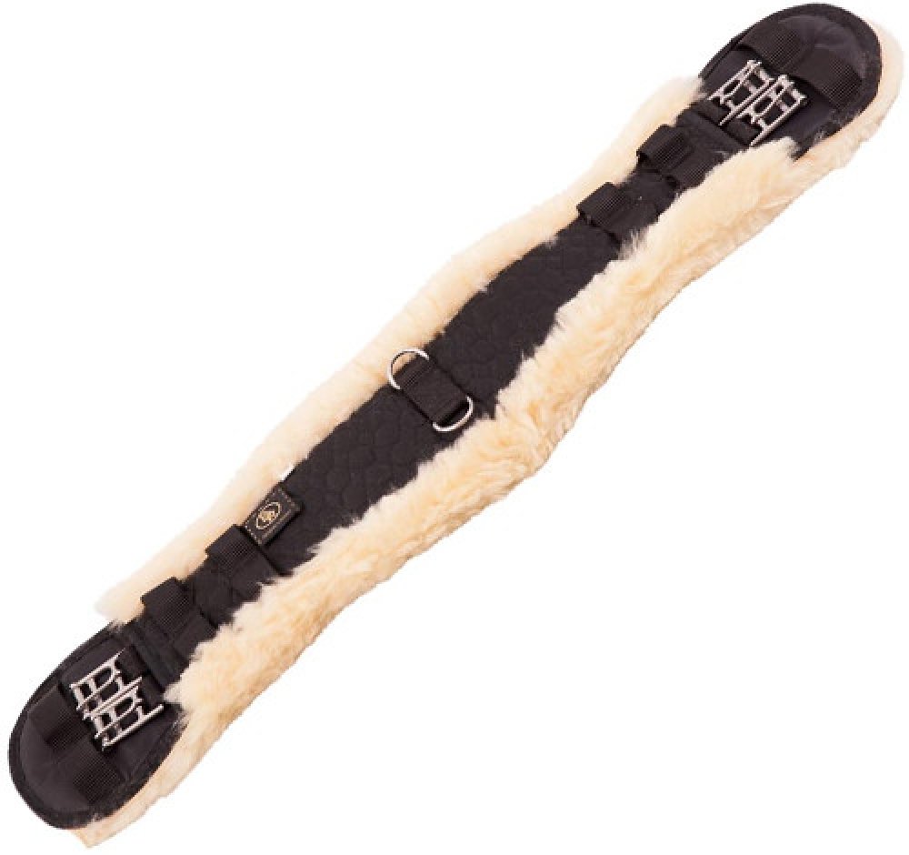 Anatomicky vykrojený drezurní podbřišník značky BR, vyrobený z pravého merino beránku. Bez dotahovacích gum. Středová část vyrobena z textilního materiálu. Díky vykrojení neomezuje pohyb předních nohou a neskřípe citlivou kůži. Zapínání na nerez přezky, 2x D-kroužky pro upevnění pomocných otěží. Velice vhodný podbřišník pro citlivé koně.
