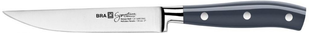 Nůž na zeleninu Signature vyniká svou elegancí a vynikajícími materiály použitými při jeho výrobě. Čepel je vyrobena z vysoce kvalitní, odolné německé nerezové oceli a nabízí vynikající řezný výkon. Nýtovaná rukojeť nabízí bezpečné a pohodlné uchopení díky svému ergonomickému designu. Je to perfektní nůž pro kuchaře a fandy, který dodá vaší kuchyni punc odlišnosti a profesionality. Je to vyvážený, velmi praktický a všestranný nůž, pevný při krájení tvrdé zeleniny jako je mrkev, brambory nebo batáty a zároveň hladký a přesný s jemnější zeleninou nebo ovocem. Charakteristika Čepel z kované německé nerezové oceli s molybdenem vanadem. Tvrdost nerezové oceli 55+-2 HRC. Plech o tloušťce 1,6 mm. Matný povrch, po broušení pro snížení tloušťky. Velmi pevná nýtovaná rukojeť. Vyrobeno z ABS a zesílené nerezové oceli 430. Ergonomický design pro pevné a velmi bezpečné uchopení. Profesionální kvalita. Vysoká pevnost a odolnost, ideální pro každodenní použití v kuchyni. Pro zachování ostrosti a přesnosti řezu se doporučuje ruční mytí a sušení. Baleno v elegantní dárkové kazetě. Délka čepele 130 mm Rukojeť nože je v barvě šedé viz poslední foto.