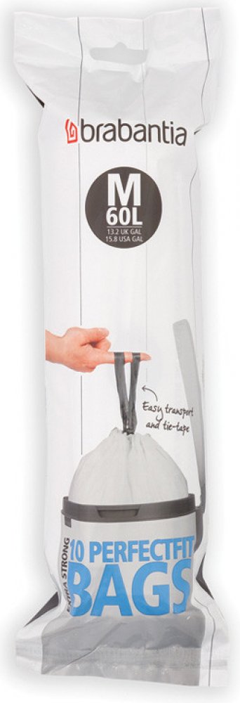 Vysoce kvalitní igelitové sáčky PerfectfitIgelitové sáčky na odpadky typu M, které mají objem 60 litrů, jsou vhodné zejména do košů Brabantia. Využití ale určitě igelitové pytle najdou i u jiných odpadkových košů – je jen potřeba zvolit vhodnou velikost. Správnou velikost pytlů zjistíte dle barevného kódu, který naleznete uvnitř víka Vašeho koše. Toto balení obsahuje 10 kusů odpadkových pytlů. Pytle jsou vyrobeny z vysoce pevného plastu (HDPE) – záruka kvality.Snadná a rychlá manipulaceOdpadkový sáček do koše snadno vložíte, navíc okraje sáčku budou skryté. Velikostně odpadkový pytel perfektně sedí – žádné viditelné okraje. Takže odpadkový koš může stále působit esteticky. Igelitové sáčky po okraji lemuje pevná stahovací páska, která Vám následně usnadní práci při vyjmutí odpadu. Barva pásky rozlišuje velikost pytlů.ParametryObjem: 60 litrů Počet: 10 ks Barva: bílá