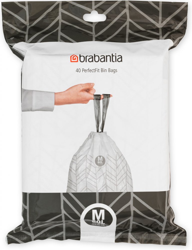Vysoce kvalitní igelitové sáčky PerfectfitIgelitové sáčky na odpadky typu M, které mají objem 60 litrů, jsou vhodné zejména do košů Brabantia. Využití ale určitě igelitové pytle najdou i u jiných odpadkových košů – je jen potřeba zvolit vhodnou velikost. Správnou velikost pytlů zjistíte dle barevného kódu, který naleznete uvnitř víka Vašeho koše. Toto balení obsahuje 40 kusů odpadkových pytlů. Pytle jsou vyrobeny z vysoce pevného plastu (HDPE) – záruka kvality.Snadná a rychlá manipulaceOdpadkový sáček do koše snadno vložíte, navíc okraje sáčku budou skryté. Velikostně odpadkový pytel perfektně sedí – žádné viditelné okraje. Takže odpadkový koš může stále působit esteticky. Igelitové sáčky po okraji lemuje pevná stahovací páska, která Vám následně usnadní práci při vyjmutí odpadu. Barva pásky rozlišuje velikost pytlů.ParametryObjem: 60 litrů Počet: 40 ks Barva: bílá