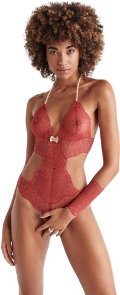 Toto nádherné body BRACLI SYDNEY SINGLE ve žhavé červené barvě vás nadchne na první pohled. Okouzlující italská krajka ušitá z té nejjemnější tkaniny je prošívaná zlatou nití Lurex, která imituje jiskřivý třpyt šlehajících plamínků ohně. Fantastický moderní střih a výrazně pružný materiál obepne vaše tělo a skvěle se přizpůsobí vašim křivkám. Je velmi pohodlné na nošení, průhledný charakter nechá nahlédnout pod pokličku a bude magneticky přitahovat pozornost vašeho protějšku. Podprsenka bez kostic a bez výplně vám dopřeje maximální komfort a a atraktivní hluboký výstřih. Zapíná se vzadu na zlatý háček a ozdobná mašlička v dekoltu s kovovým přívěskem vám pak dodá šmrnc, stejně tak bohatá řada korálků z perel krémové barvy, která nahrazuje ramínka a zavazuje se za krkem na saténovou stuhu. Díky tomu odhaluje body vaše ramena a šíje pro svůdné horké polibky. Bříško decentně zahalí pruh krajky, který se spojuje se spodní částí, jež napodobuje tanga.