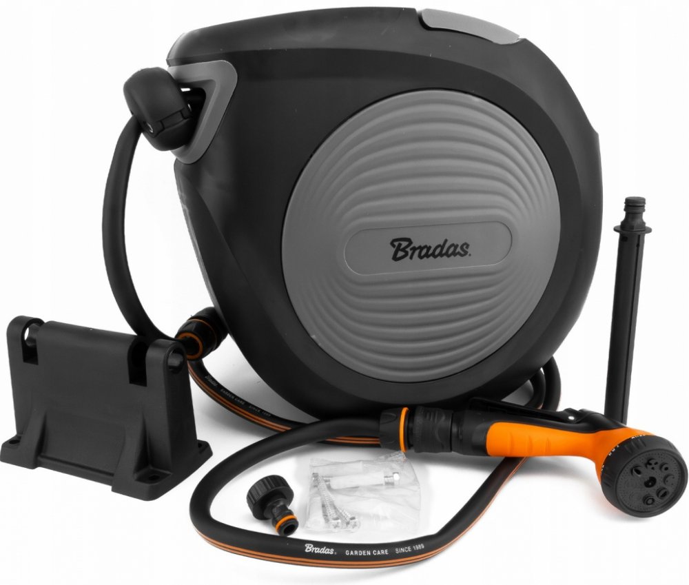 - Nástěnný box na hadici Bradas obsahuje sadu šroubů pro uchycení na stěnu pro snadnou instalaci