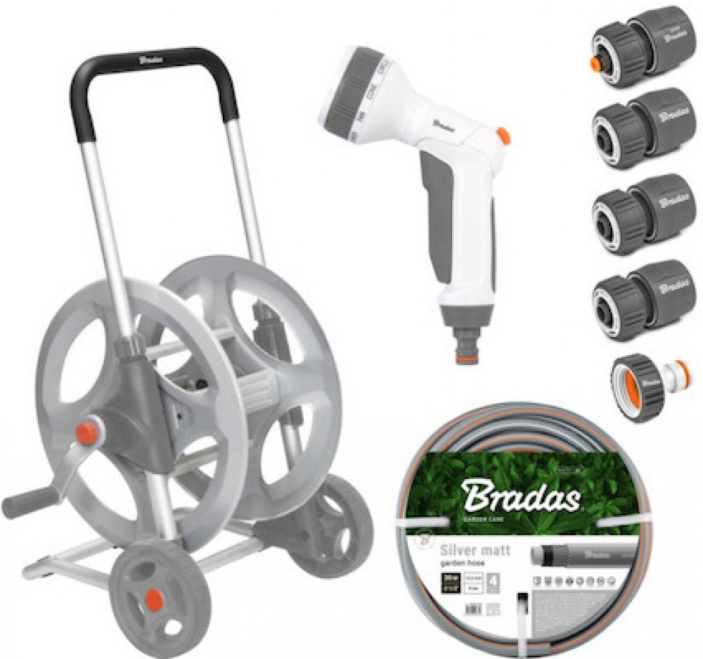 Hlavní parametry: kapacita bubnu až 70 m, délka hadice 30 m, průměr hadice 1/2", set pro připojení včetně postřikovače (pistole), transportní kolečka, materiál ocel, hliník, plast Pojízdný naviják WHITE LINE s hadicí 1/2" 30 m a příslušenstvím SILVER PRO SET, kovový - BRADAS