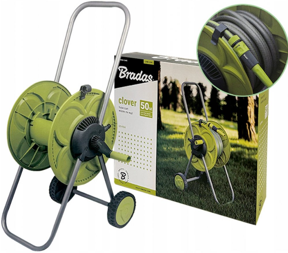 Vozík na zahradní hadici BRADAS Lime Line Clover s lehkou a odolnou konstrukcí. Jeho buben je vyrobený ze silného plastu odolného vůči UV záření, rzi a korozi. Dlouhá kovová rukojeť usnadňuje manipulaci. Vybavený držákem. Otočné připojení konektoru zabraňuje kroucení hadice při jejím odvíjení a převíjení.