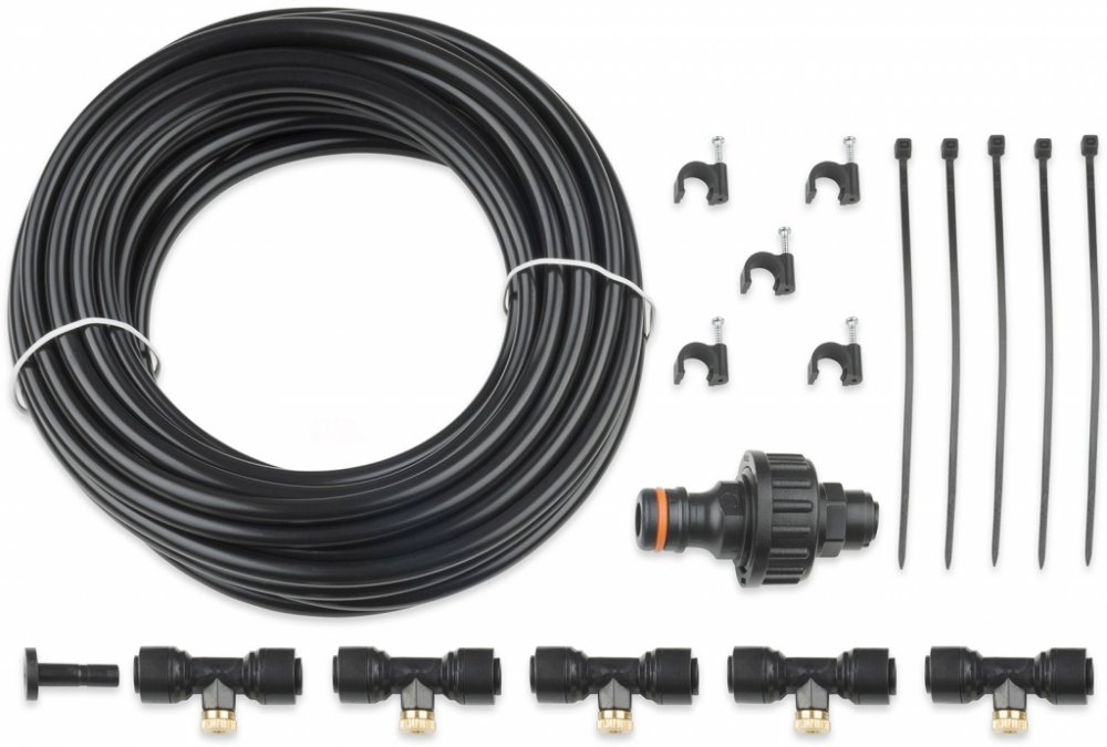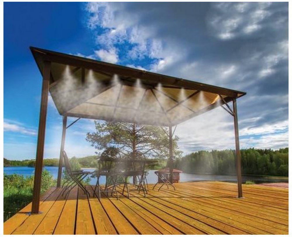 Vodní mlžná brána, která vás příjemně ochladí na terase vašeho domu, restaurace či kavárny, nebo na vaší zahradě. Díky systému pěti úhlově nastavitelných mosazných trysek ochladíte vzduch v parném létě o 10 až 12°C. Připojení je možné přímo na zahradní hadici. Montáž i údržba je velice snadná.