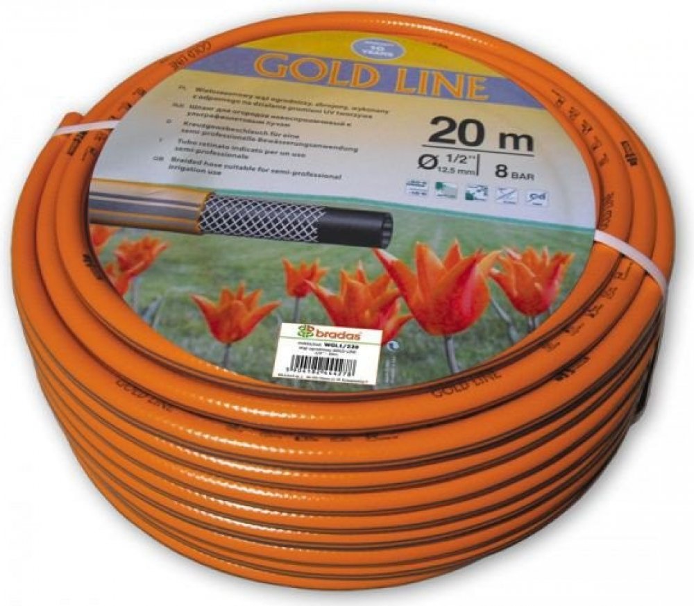 Oranžová zahradní hadice GOLD LINE je vybavena 3 vrstvami z měkčeného PVC se zvýšenou odolností a navíc vyztužena syntetickým křížovým opletem. Odolává UV záření a usazujícím se řasám. Lze ji využít pro zavlažování zahrad a zemědělských půd.