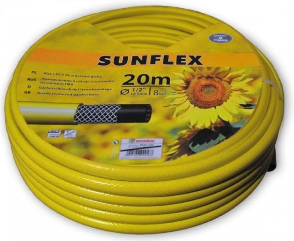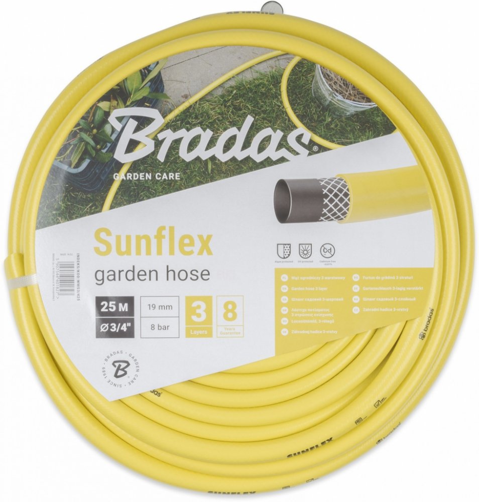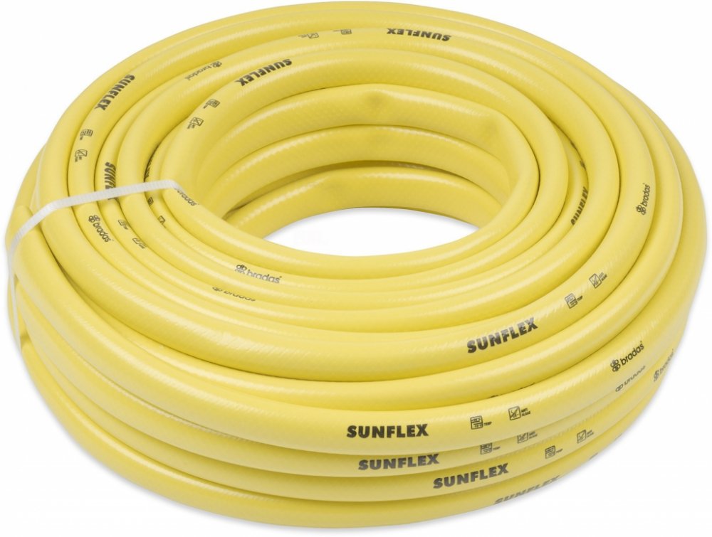 Žlutá zahradní hadice SUNFLEX je vybavena 3 vrstvami z měkčeného PVC a navíc vyztužena syntetickým křížovým opletem. Odolává UV záření a usazujícím se řasám. Lze ji využít pro zavlažování zahrad a zemědělských půd.