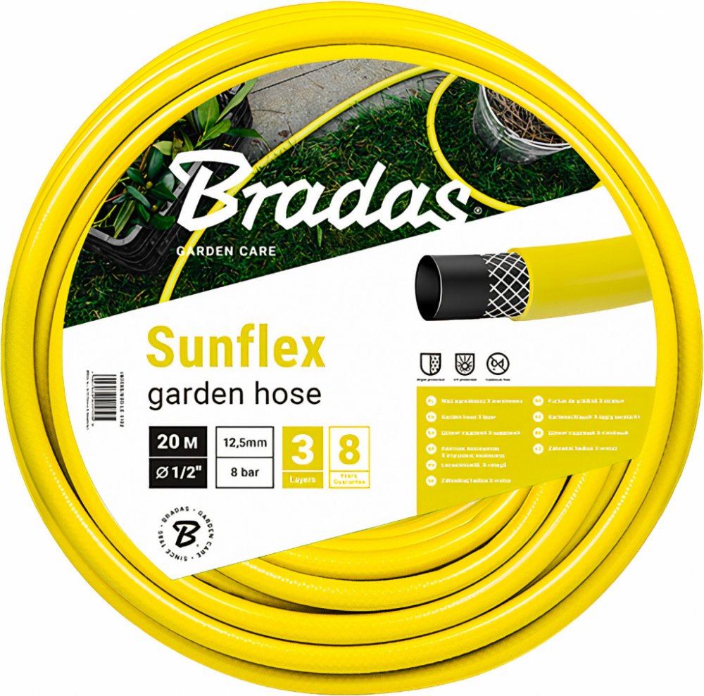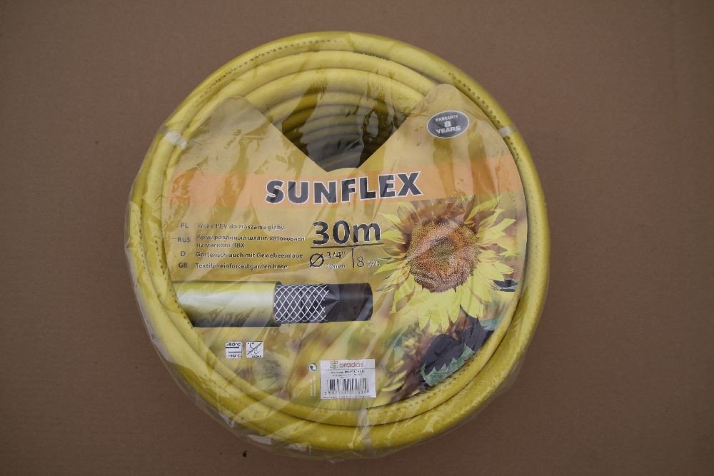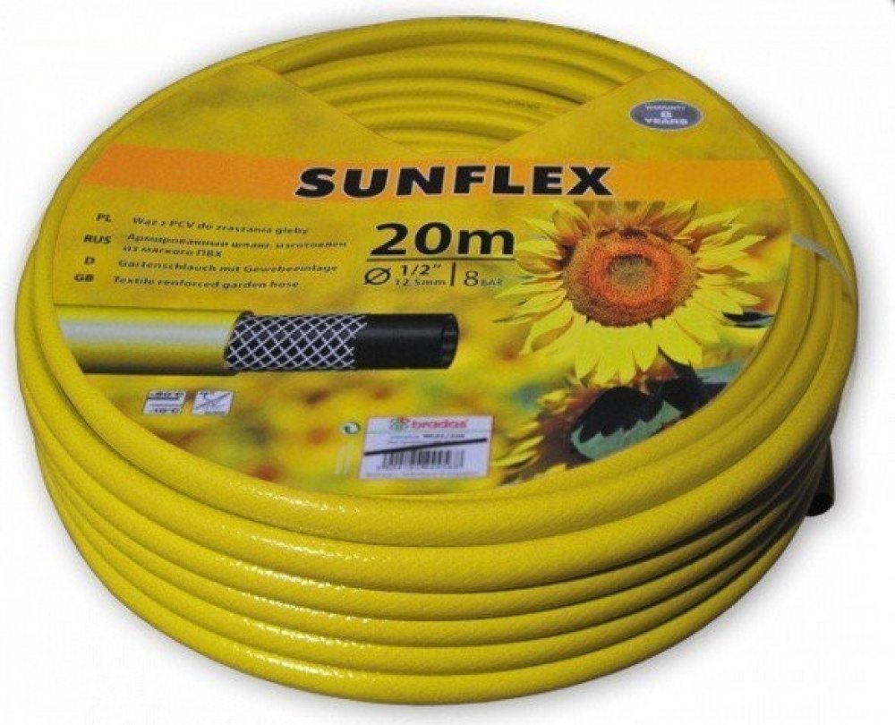 Žlutá zahradní hadice SUNFLEX je vybavena 3 vrstvami z měkčeného PVC a navíc vyztužena syntetickým křížovým opletem. Odolává UV záření a usazujícím se řasám. Lze ji využít pro zavlažování zahrad a zemědělských půd.