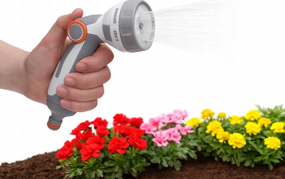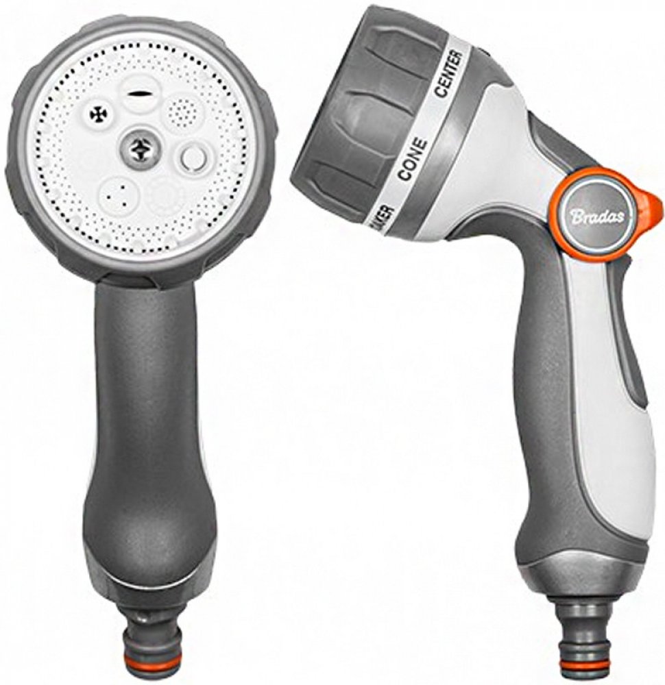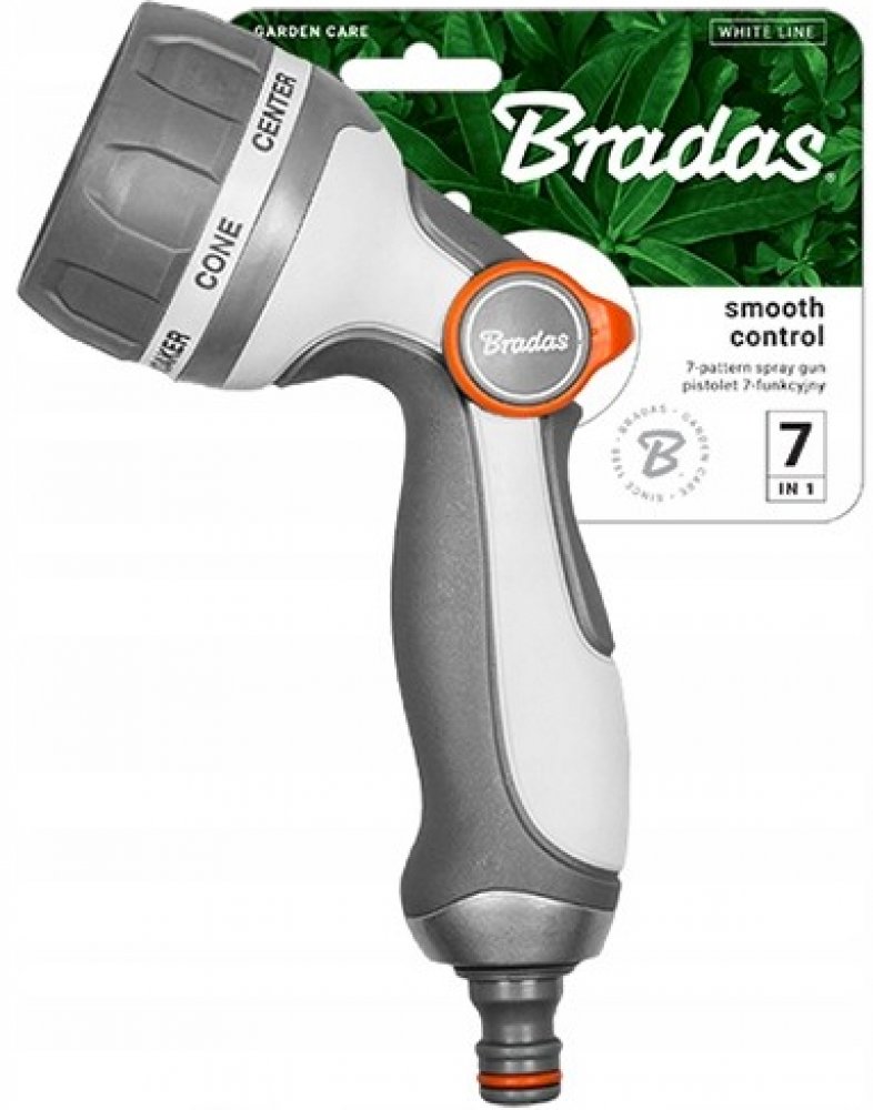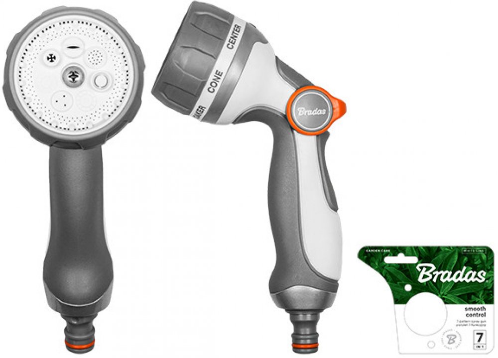 Kovová 7funkční nastavitelná zavlažovací pistole BRADAS White Line SMOOTH CONTROL s regulací průtoku vody, patentovaným spínačem a regulací přítoku a odtoku vody je nezbytným pomocníkem při práci na zahradě.