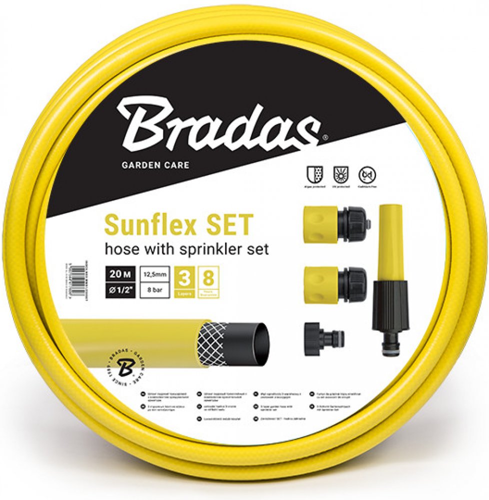 POPISZahradní hadice Sunflex 1/2" je třívrstvá a vyztužená, vyrobená z měkčeného PVC.Kompletní sada s rychlospojkou, stopspojkou, šroubením na kohoutek a regulovatelným postřikovačem1.vrstva - vnitřní vrstva z černého PVC, odolná proti UV záření a ukládání řas v hadici.2.vrstva - pletená křížová syntetická vlákna3.vrstva - venkovní, žlutá transparentní fólie z měkčeného PVCSADA OBSAHUJE20m 3 vrstvé 1/2" zahradní hadice s UV filtrem1x regulovatelný postřikovač1x přípojka k přívodu vody2x rychlospojka (1x stop, 1x standard)