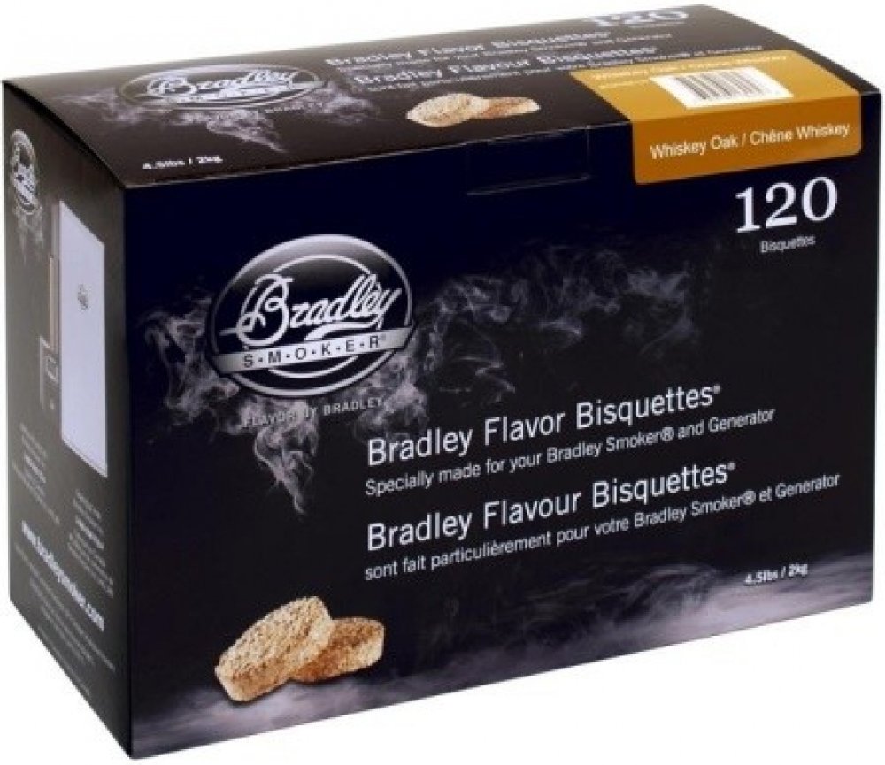 Tajemství skvělých kuchařských delikates z udíren Bradley spočívá v dřevěných briketách. Bradley BRIKETY jsou vyrobeny z přírodního tvrdého dřeva, bez přísad. Třísky jsou lisovány v přesném množství, pod stalým tlakem a hustotou. Testy Technologického institutu Britské kolubmie prokázaly, že brikety Bradley Bisquettes produkují kouř čtyřikrát čistší než kouř při klasickém hoření dřeva. Bredley udírna si automaticky podává ze zásobníku briketky, které se rozehřejí a produkují chladný kouř. Po prohoření padají do misky v udírně ve které je voda. Topné těleso v udírně pak ohřívá kouř podle nastavení dané teploty. Kouřové aroma je produkováno v počátečních minutách hoření. Bradley udírna spálí jednu briketu za 20 minut a produkuje čisté kouřové aroma. Chuť kouře je dána různými druhy dřeva při uzení. Druhy dřevěných briket: Mesquite keř rodu Prosopis – díky svým vlastnostem vyhledáván pro uzení masa. Olše a javor dávají bohatou a výraznou chuť pokrmu, používají se na uzení mořských plodu, šunky a slaniny. Tvrdost dřeva předurčuje odlišné chutě kouře. Dub a vlašský ořech běžně používané pro uzení hovězího, zvěřiny a vepřového masa, jako je vepřová plec a hovězí žebra. Jabloň a třešen sladší a jemnější kouřové aroma, běžně se používají na kuřecí maso a sladkovodní ryby. Bradley-Smoker Blend speciální směs různých druhů dřev, která je patří má tak delikátní chuť kouře, že nese jméno značky těchto udíren. Whiskey Oak Special Edition brikety vyrobené z dubových sudů od whisky , bohatá chuť. vhodné na hovězí maso, zvěřina, vepřové. Pacific Blend určené na ryby a mořské plody a májí jemnou vuni a čistou chuť. Vhodné na mořské ryby, drůbež,, zelenina, sýr Zabaleno v krabicích po: 120 kusů (40 hodin kouře)