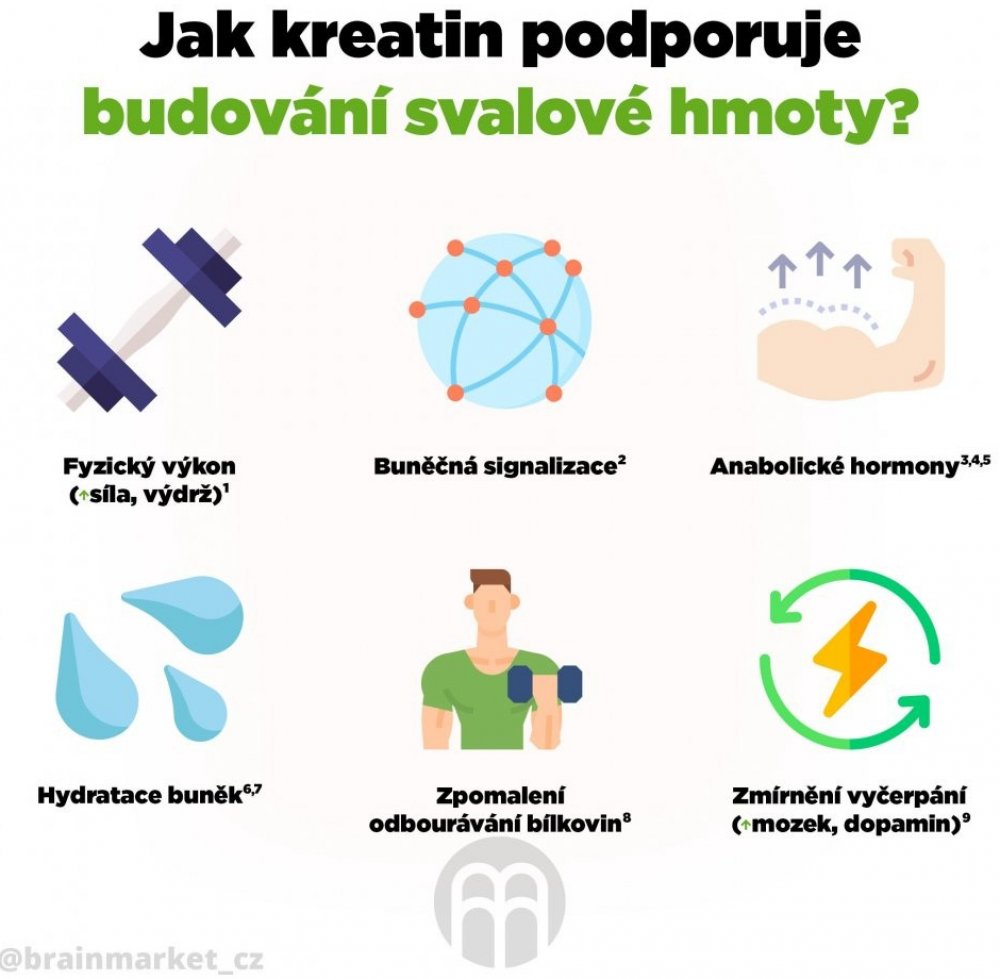 No pain no gain. Kreatin působí jako palivo pro svaly. Svaly jsou plné mitochondrií, kterým kreatin dodává energii. Tato energie pomáhá k rychlejšímu růstu, kvalitnější regeneraci a díky tomu se zvyšuje síla, výbušnost i objem. Kreatin proniká také do mozku, kde stejně jako ve svalech stimuluje mitochondrie, zvyšuje ATP a zvyšuje tak kognitivní výkon.