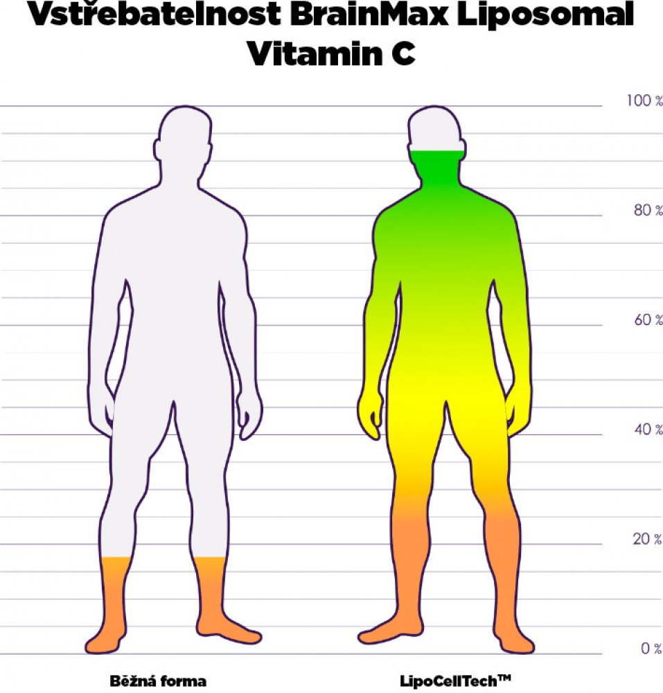 Vitamín C je zapouzdřen v nano částicích zvaných lipozomy a díky tomu dokáže projít skrz stěnu tenkého střeva a dostat se do krevního řečiště. Běžné formy vitamínu C střevní bariéru překonávají jen s velkými obtížemi a proto se vstřebá do krevní plazmy pouze 8% vitamínu C. Proto je lipozomální vitamín C jasnou volbou pro všechny, kteří potřebují podpořit organismus během nemoci a chtějí posílit celkovou imunitu. Vstřebatelnost lipozomálního vitamínu C je až 95%.