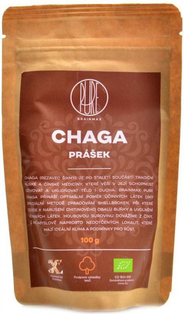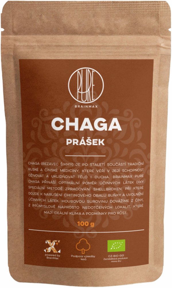 Chaga je dřevokázná houba, která nejčastěji napadá listnaté stromy, zejména břízy, kterými prorůstá. Houba je známá již z dob před cca 4000 lety, využívali jí Mezopotámci, Egypťané a Číňané. Tato vitální houba je bohatá na živiny, zejména vitamíny skupiny B, D a dále minerály jako je draslík, selen, zinek nebo měď. BrainMax Chaga pochází z Číny, kde roste v čistých lokalitách, nedotčených průmyslem, kde je ideální klima a podmínky pro růst.