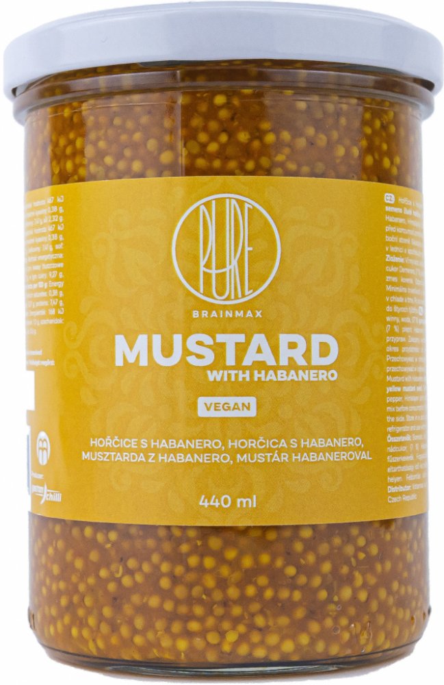 Vinný ocet, voda, semeno žluté hořčice, třtinový cukr Demerara, paprika Habanero, himalájská růžová sůl, směs koření.