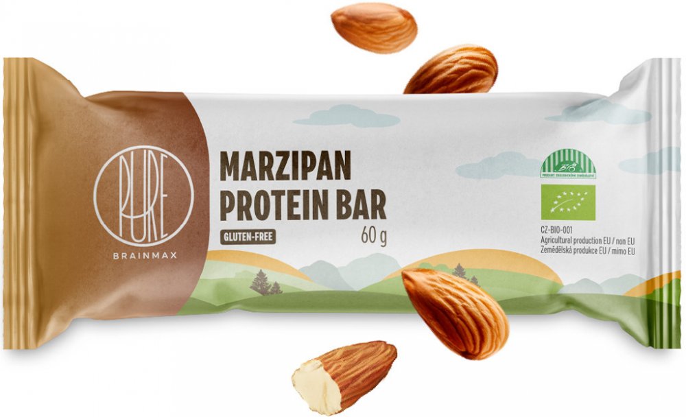 Marcipán: (25 %) směs proteinů (syrovátkový protein, mléčný protein*), kukuřičná vláknina*, (16,6 %) hořká čokoláda* (kakaová hmota*, třtinový cukr*, kakaové máslo*, emulgátor: sójový lecitin*, vanilkový extrakt*), mandlový krém*, zvlhčující látka: glycerol*, kakaové máslo*, sušené mléko*, sladidlo: erythritol*, přírodní aroma. Produkt obsahuje 98,4 % BIO surovin.