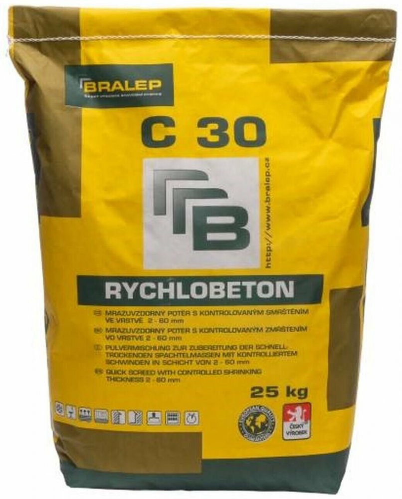 Mrazuvzdorný rychlobeton BRALEP C 30 pro vytvoření potěrů s rychlým úbytkem vlhkosti a vysokým nárůstem počáteční pevnosti.PoužitíDo interiéru i exteriéru.Pro vytváření potěrů s rychlým úbytkem vlhkosti a vysokým nárůstem počátečních pevností.Pro vyplnění otvorů, hlubších nerovností a navýšení podkladu před nivelováním.Možnost vylití cementové samonivelační stěrky na BRALEP C 30 již po 60–180 min. a to bez použití penetrace.VlastnostiPevný s kontrolovaným smrštěnímPochozí již po 30-90 min.Po vyzrání mrazuvzdornýPro vyrovnání ve vrstvě od 2 do 60 mmTechnické parametrySpotřeba: 1,8 kg / m² / mmPokládky: za 24 hod. (dle typu krytiny)Balení: 25 kg