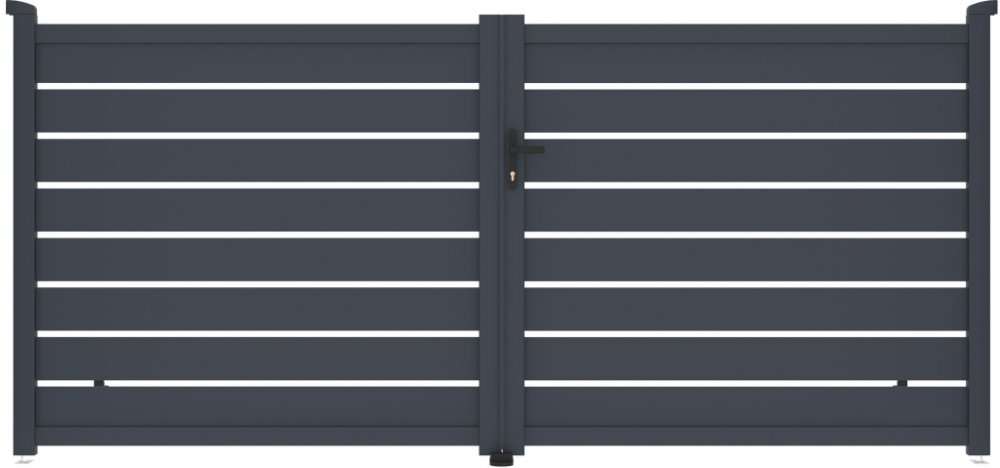 Výplň s horizontálně uloženými lamelami v atraktivním grafitovém provedení kombinuje dostatek soukromí s moderním designem, takže brána s otevíráním dovnitř bude slušet každému typu oplocené stavby.