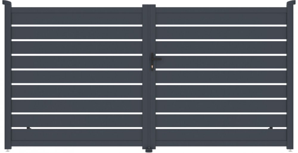 Výplň s horizontálně uloženými lamelami v atraktivním grafitovém provedení kombinuje dostatek soukromí s moderním designem, takže brána s otevíráním dovnitř bude slušet každému typu oplocené stavby.