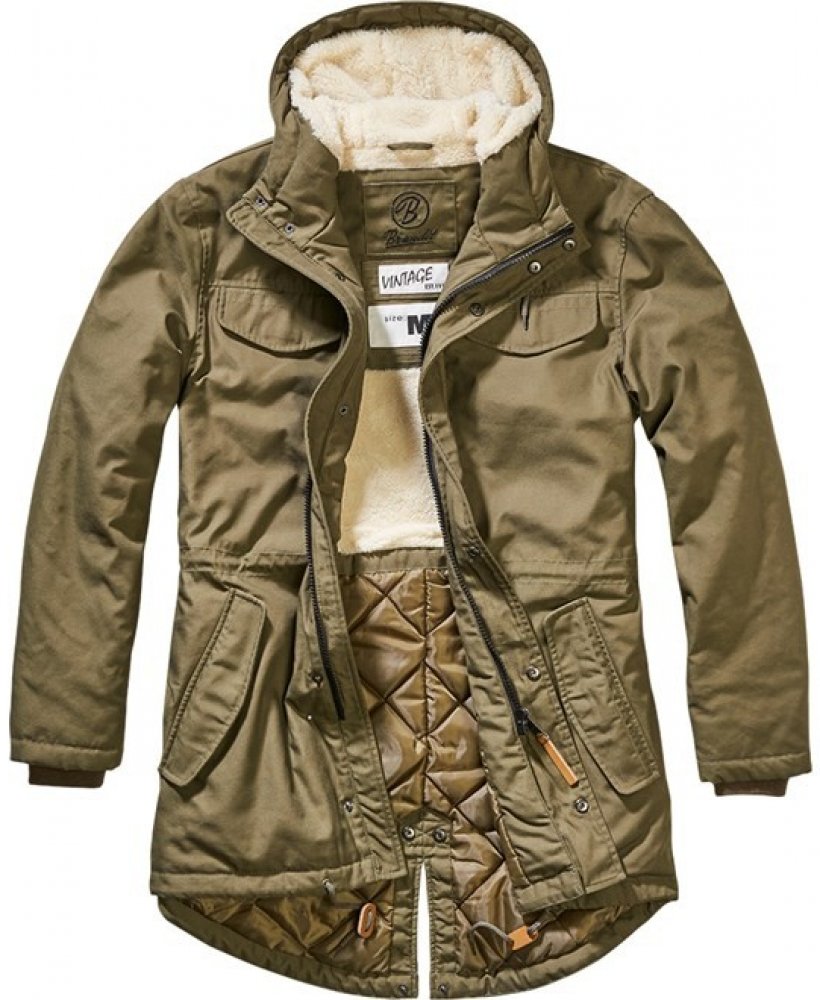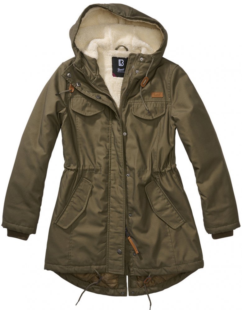 Zimní parka od německé firmy Brandit se zateplenou kapucou a vrchní částí umělou kožešinou. Zapínání je řešeno formou dlouhého zipu doplněného o druky. Ve vnitřní části cvoky na rozšíření zadní prodloužené části, která má rozparek pro pohodlné nošení. Na kapuci, v pase a spodním lemu šňůrka ke stažení.