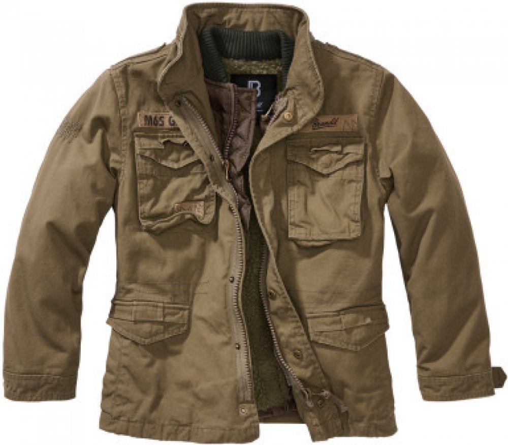 Dětská bunda M65 Giant, Brandit Tato dětská bunda od Branditu je replikou původního modelu armádní M65. Je robustní, dostatečně odolná a teplá. Bunda je vyrobená z oprané bavlny, který ji dává jedinečný vzhled. Má dále odnímatelnou vložku. Uvnitř bundy jsou čtyři užitečné kapsy se zapínáním na knoflík. Z vnější strany bundy jsou na stranách dvě rozparkové kapsy. Tato M65ka má skrytou kapuci v límc...