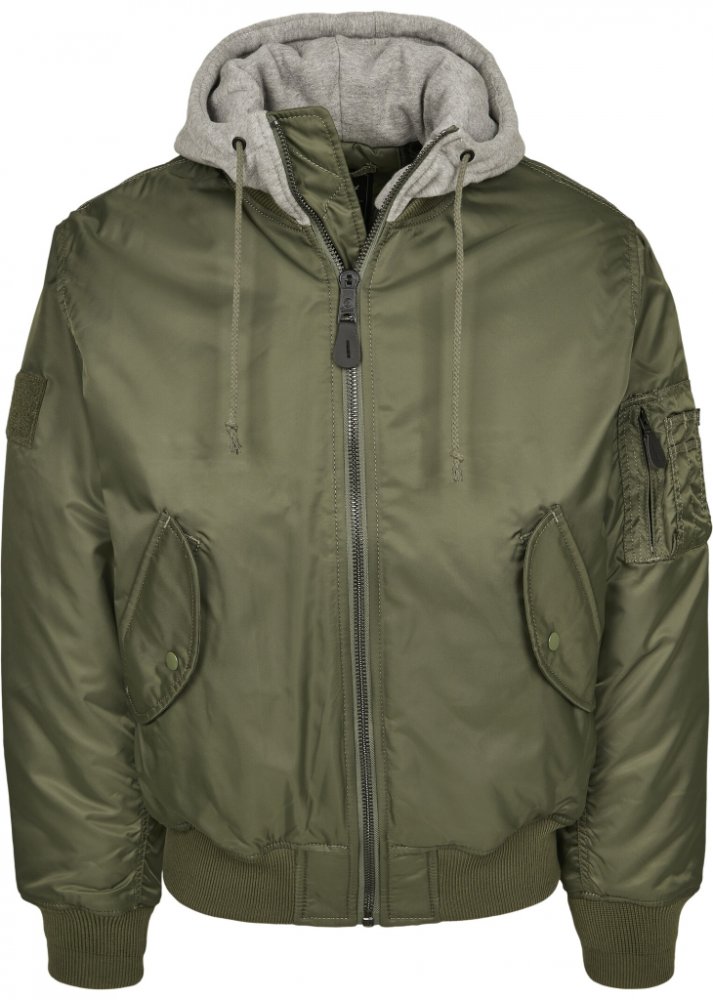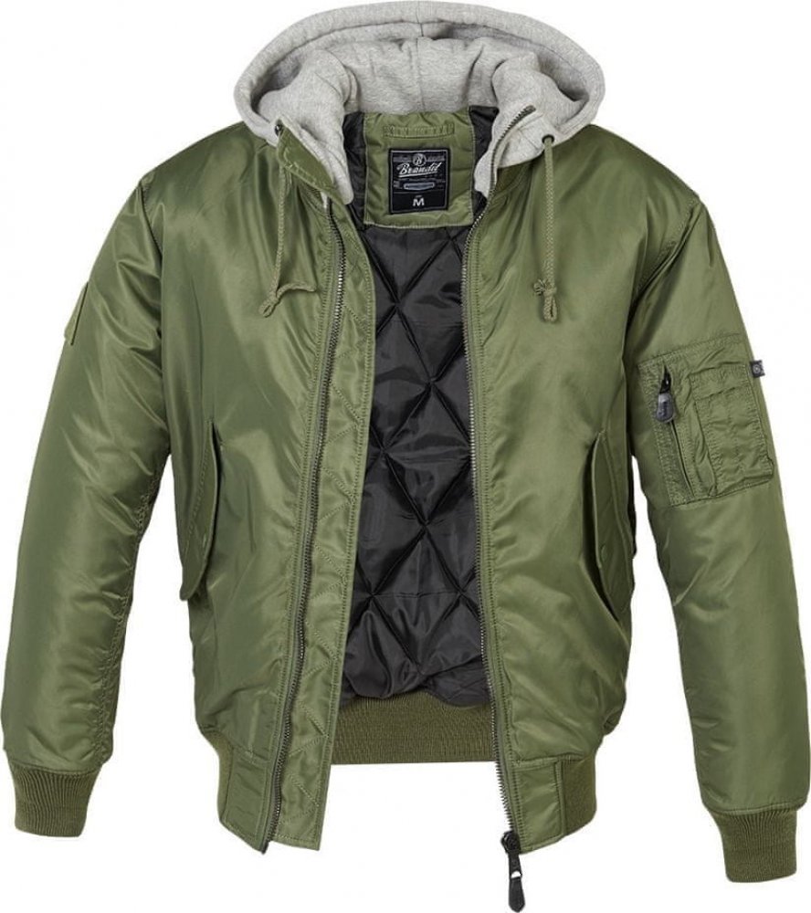 BRANDIT BUNDA MA1 Sweat Hooded Jacket olivovo-šedá Bunda leteckého stylu je vyrobená z pevného, voděodolného a větruodolného materiálu, takže dobře chrání nejen v chladném, ale i povětrnostném počasí. Na bokách se nacházejí dvě prostorné kapsy kryté tvarovanými patkami se zapínáním na patenty. Uvnitř jsou zhotoveny další dvě kapsy. Na pravém rameni je typická kombinovaná kapsa. Zapínání bundy je ř...