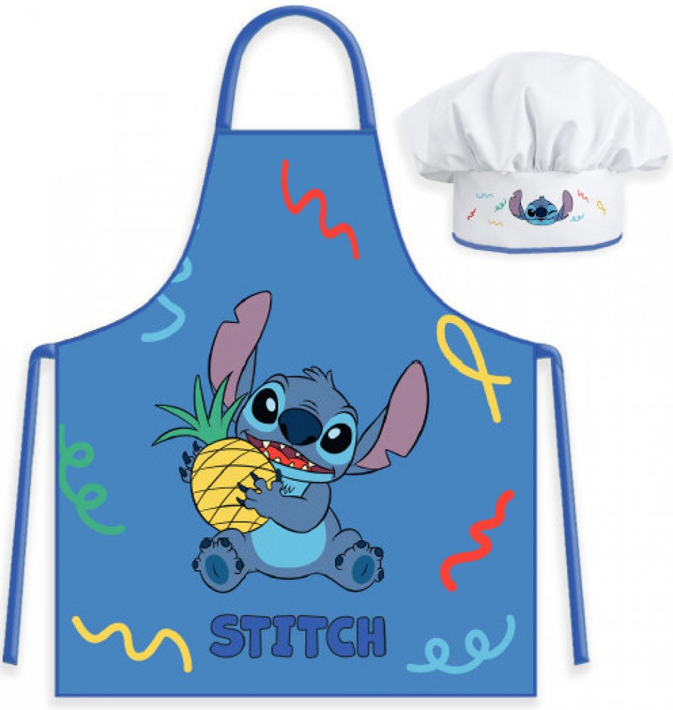 Praktická souprava zástěry a kuchařské čepice Lilo & Stitch s obrázkem mimozemšťana Stitche s ananasem. Skvěle se hodí do kuchyně, na výtvarnou výchovu, keramiku i další tvořivé aktivity. Vhodná pro děti od 3 do 8 let.