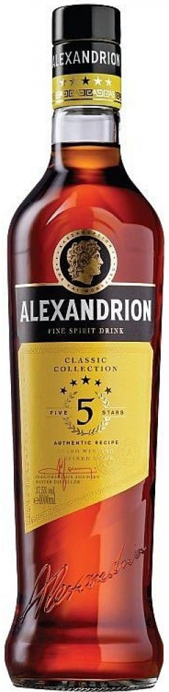 Alexandrion 5* je jemná a vyvážená směs, doplněná stařeným vinným destilátem a směsí přírodních extraktů, s jemnými dozvuky středomořských vůní a dubového dřeva.
