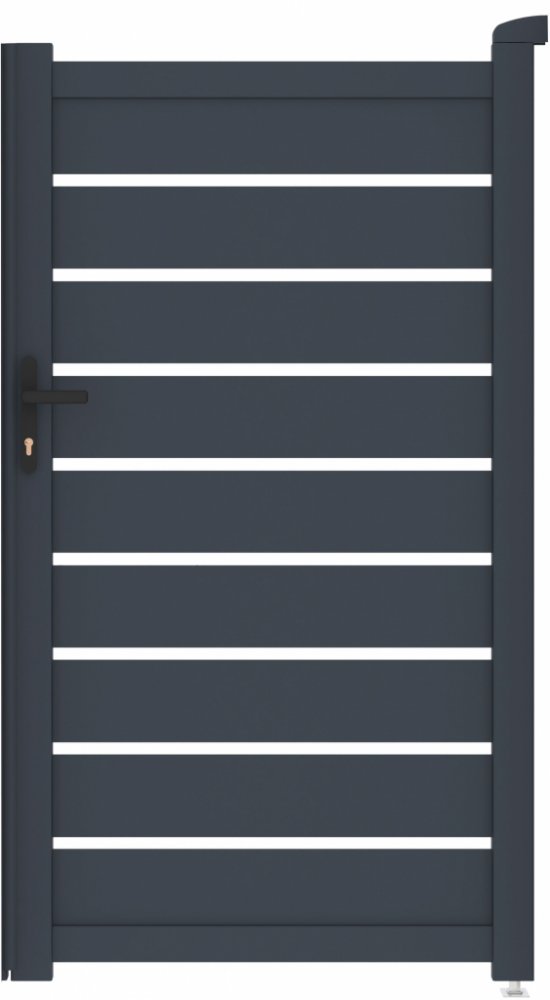 Výplň s horizontálně uloženými lamelami v atraktivním grafitovém provedení kombinuje dostatek soukromí s moderním designem, takže branka s otevíráním dovnitř bude slušet každému typu oplocené stavby.