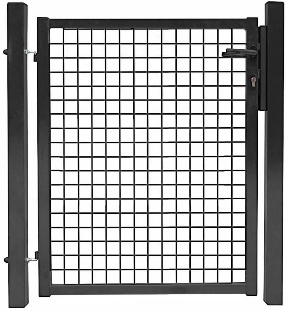 Součástí branky jsou také 2 sloupky o průměru 60x60 mm, nastavitelné panty, PVC klika a příprava na zámek FAB. Zámek není součástí!