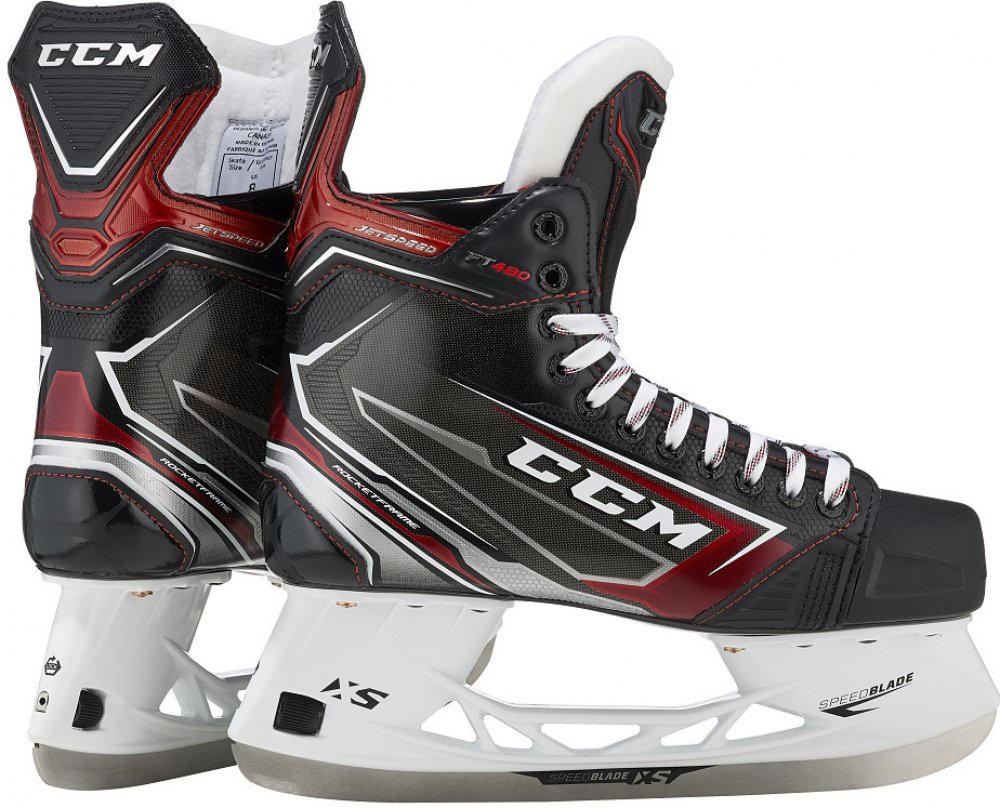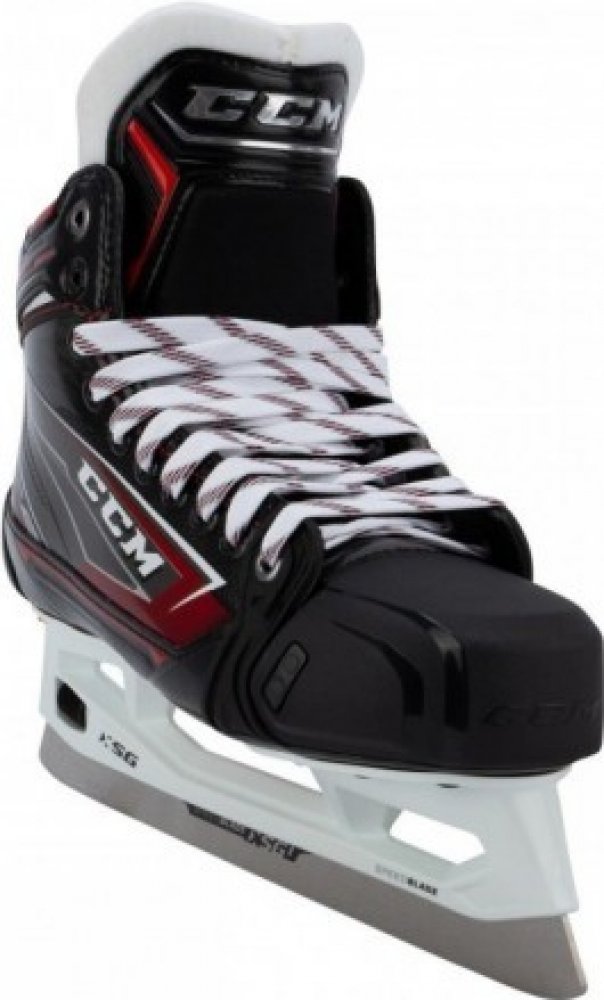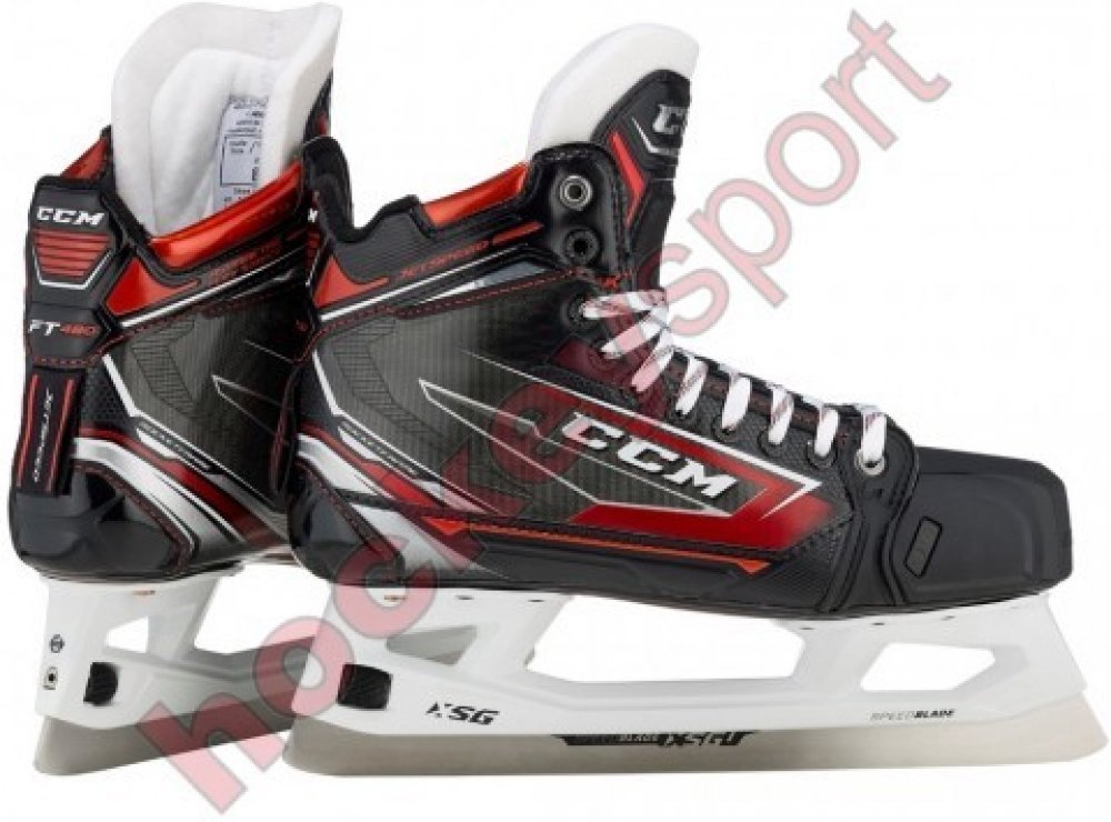Nová generace brankářských bruslí CCM JETSPEED. Špičkové atraktivní brankářské brusle CCM JETSPEED FT480 jsou druhým nejvyšším modelem nové řady. s novou konstrukcí boty s využitím kompozitových materiálů a s novým brankářským holderem CCM SPEEDBLADE XSG, který umožňuje bleskovou výměnu nože bez použití jakéhokoliv nářadí. Nůž je navíc o 2 mm vyšší oproti starším typům nožů a umožňuje tak brankáři větší náklon brusle a tím dřívější záběr do odrazu. Brusle jsou tepelně tvarovatelné a umožňují tak každému perfektní natvarování podle individuálních potřeb.
