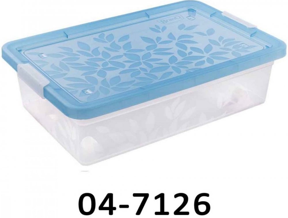Transparentní plastový box. Silné zacvakávací uzávěry na obou stranách. Boxy jsou stohovatelné. Různé barvy. Úložný box je transparentní. Má ražbu květinového vzoru.