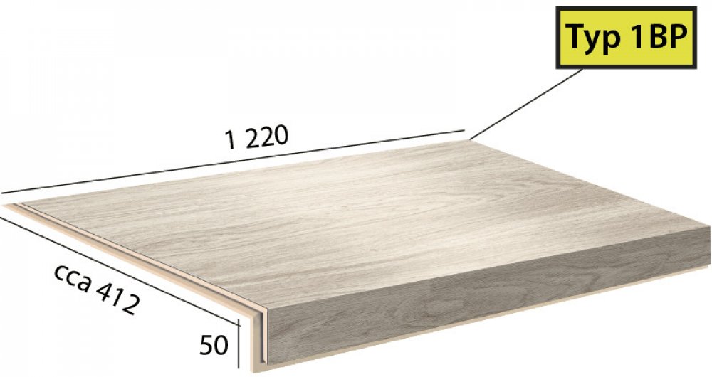 Vinylové schody Ecoline Step v dekoru 9502 Kaštan bělený, dílec 1BP - schod bez nosu s boční úpravou pro otevřené schodiště (zprava).