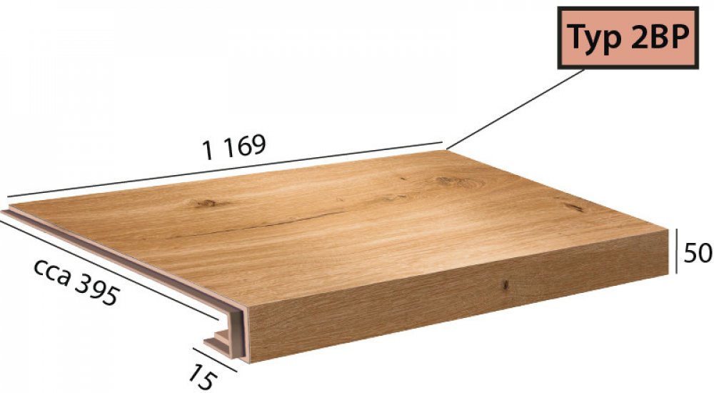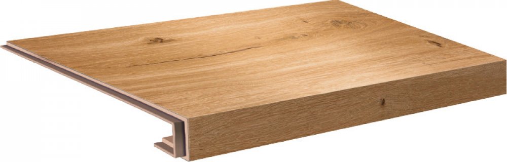 Vinylové schody v dekoru Ecoline Step - 9590 Dub královský hnědý, dílec 2BP – schod s nosem pro orevřené schodiště z pravé strany (boční úprava zprava).