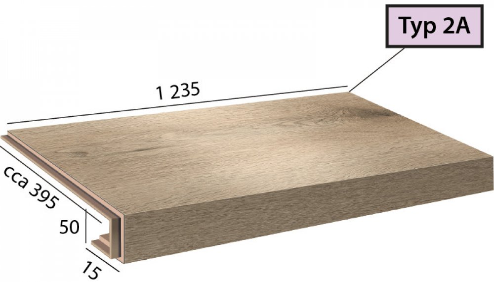Vinylové schody v dekoru Objectline Step - 9870 Dub Costa pískový, dílec 2A – schod s nosem pro uzavřené schodiště, vlevo i vpravo zámek.